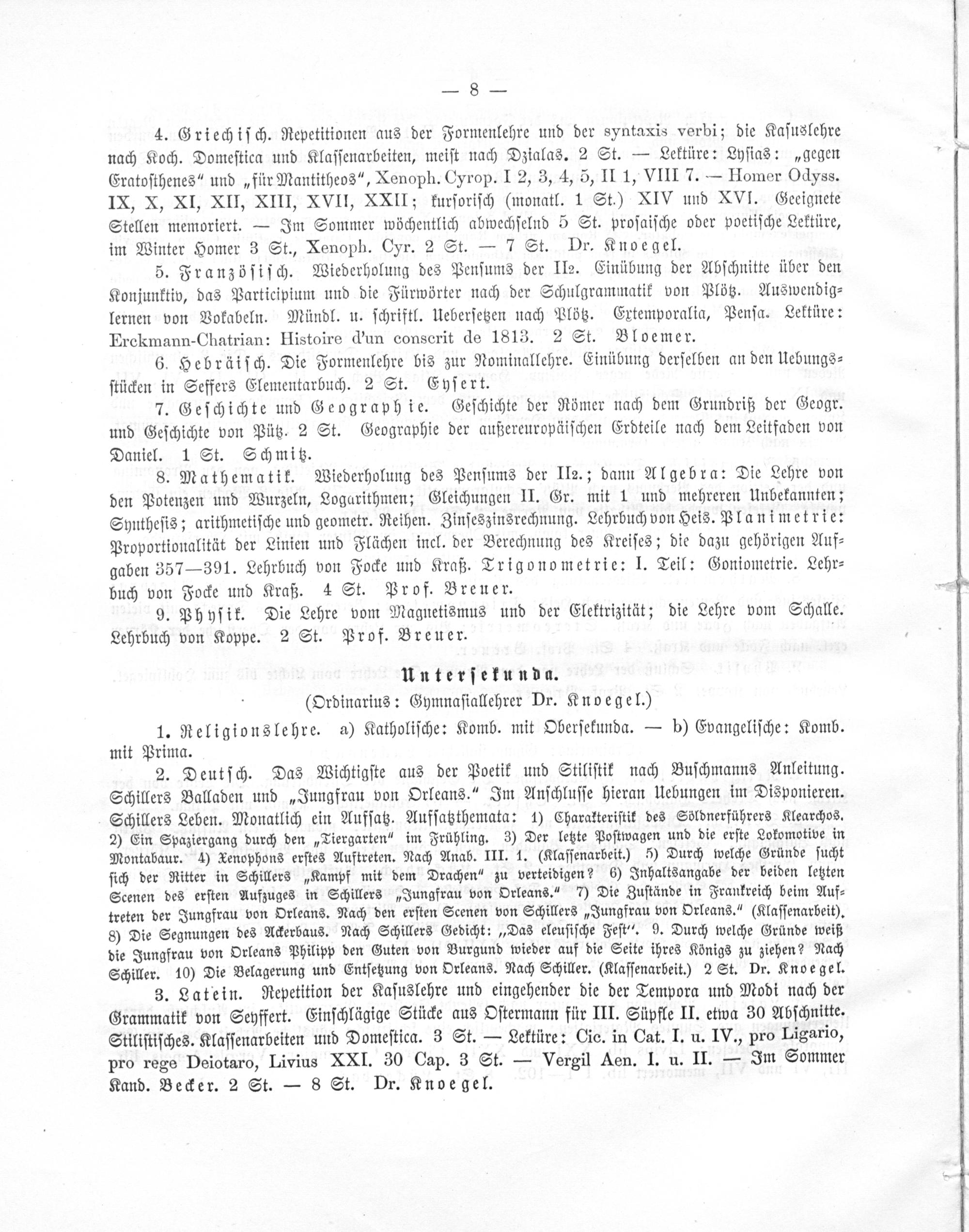2. Deutſch. Das Wichtigſte aus der Poetik und Stiliſtik nach Buſchmanns Anleitung. Schillers Balladen und„Jungfrau von Orleans.“ Im Anſchluſſe hieran Uebungen im Disponieren. Schillers Leben. Monatlich ein Aufſatz. Aufſatzthemata: 1) Charakteriſtik des Söldnerführers Klearchos. 2) Ein Spaziergang durch den„Tiergarten“ im Frühling. 3) Der letzte Poſtwagen und die erſte Lokomotive in Montabaur. 1) Xenophons erſtes Auftreten. Nach Anab. III. 1.(Klaſſenarbeit.) 5) Durch welche Gründe ſucht ſich der Ritter in Schillers„Kampf mit dem Drachen“ zu verteidigen? 6) Inhaltsangabe der beiden letzten Scenen des erſten Aufzuges in Schillers„Jungfrau von Orleans.“ 7) Die Zuſtände in Frankreich beim Auf⸗ treten der Jungfrau von Orleans. Nach den erſten Scenen von Schillers„Jungfrau von Orleans.“(Klaſſenarbeit). 8) Die Segnungen des Ackerbaus. Nach Schillers Gedicht:„Das eleuſiſche Feſt“. 9. Durch welche Gründe weiß die Jungfrau von Orleans Philipp den Guten von Burgund wieder auf die Seite ihres Königs zu ziehen? Nach Schiller. 10) Die Belagerung und Entſetzung von Orleans. Nach Schiller.(Klaſſenarbeit.) 2 St. Dr. Knoegel.