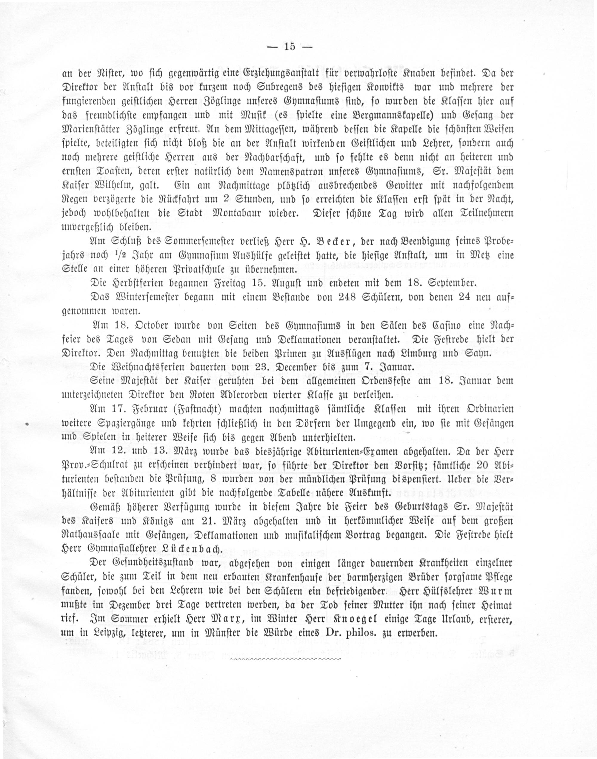 an der Niſter, wo ſich gegenwärtig eine Erziehungsanſtalt für verwahrloſte Knaben befindet. Da der Direktor der Anſtalt bis vor kurzem noch Subregens des hieſigen Konvikts war und mehrere der fungierenden geiſtlichen Herren Zöglinge unſeres Gymnaſiums ſind, ſo wurden die Klaſſen hier auf das freundlichſte empfangen und mit Muſik(es ſpielte eine Bergmannskapelle) und Geſang der Marienſtätter Zöglinge erfreut. An dem Mittageſſen, während deſſen die Kapelle die ſchönſten Weiſen ſpielte, beteiligten ſich nicht bloß die an der Anſtalt wirkenden Geiſtlichen und Lehrer, ſondern auch noch mehrere geiſtliche Herren aus der Nachbarſchaft, und ſo fehlte es denn nicht an heiteren und ernſten Toaſten, deren erſter natürlich dem Namenspatron unſeres Gymnaſiums, Sr. Majeſtät dem Kaiſer Wilhelm, galt. Ein am Nachmittage plötzlich ausbrechendes Gewitter mit nachfolgendem Regen verzögerte die Rückfahrt um 2 Stunden, und ſo erreichten die Klaſſen erſt ſpät in der Nacht, jedoch wohlbehalten die Stadt Montabaur wieder. Dieſer ſchöne Tag wird allen Teilnehmern unvergeßlich bleiben.