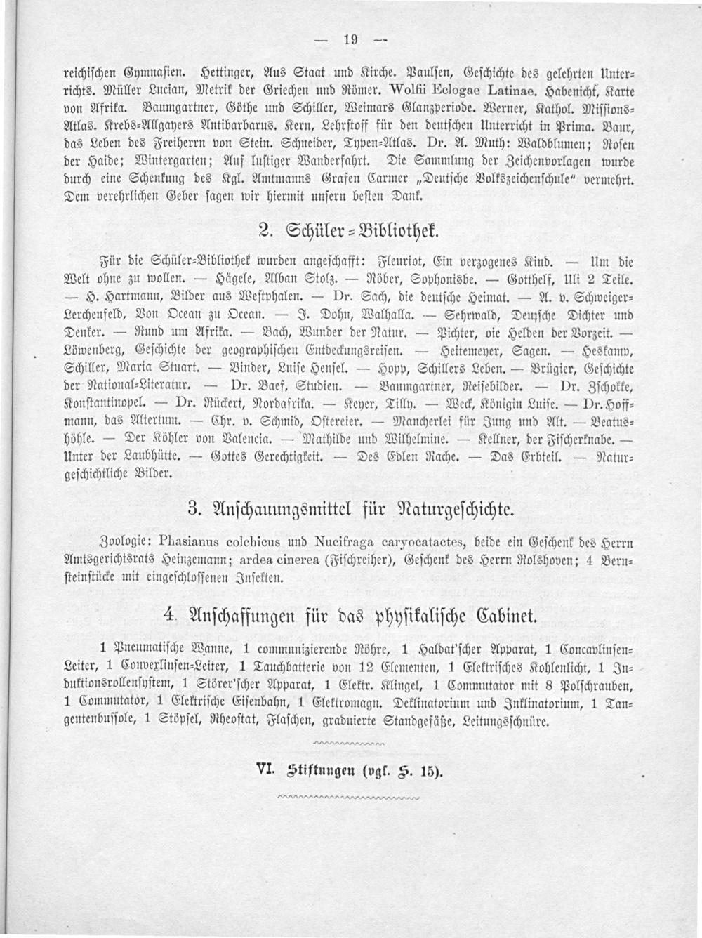 reichiſchen Gymnaſien. Hettinger, Aus Staat und Kirche. Paulſen, Geſchichte des gelehrten Unter⸗ richts. Müller Lucian, Metrik der Griechen und Römer. Wolfii Eclogae Latinae. Habenicht, Karte von Afrika. Baumgartner, Göthe und Schiller, Weimars Glanzperiode. Werner, Kathol. Miſſions⸗ Atlas. Krebs⸗Allgayers Antibarbarus. Kern, Lehrſtoff für den deutſchen Unterricht in Prima. Baur, das Leben des Freiherrn von Stein. Schneider, Typen⸗Atlas. Dr. A. Muth: Waldblumen; Roſen der Haide; Wintergarten; Auf luſtiger Wanderfahrt. Die Sammlung der Zeichenvorlagen wurde durch eine Schenkung des Kgl. Amtmanns Grafen Carmer„Deutſche Volkszeichenſchule“ vermehrt. Dem verehrlichen Geber ſagen wir hiermit unſern beſten Dank.
