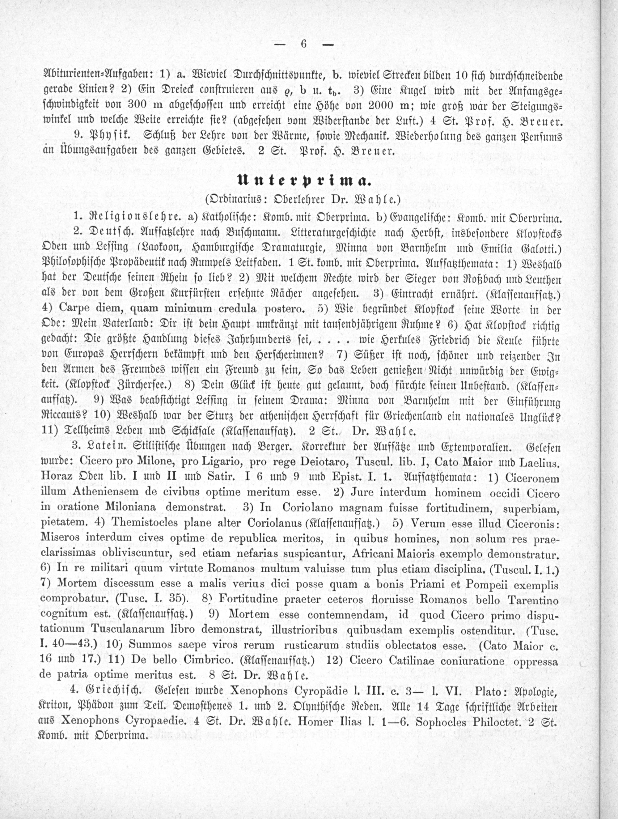 Unterprima. (Ordinarius: Oberlehrer Dr. Wahle.)