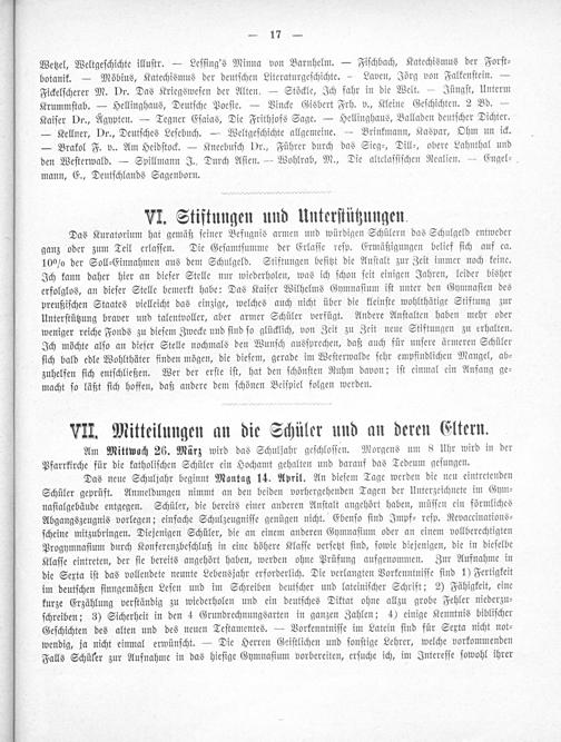 Das Kuratorium hat gemäß ſeiner Befugnis armen und würdigen Schülern das Schulgeld entweder ganz oder zum Teil erlaſſen. Die Geſamtſumme der Erlaſſe reſp. Ermäßigungen belief ſich auf ca. 10% der Soll⸗Einnahmen aus dem Schulgeld. Stiftungen beſitzt die Anſtalt zur Zeit immer noch keine. Ich kann daher hier an dieſer Stelle nur wiederholen, was ich ſchon ſeit einigen Jahren, leider bisher erfolglos, an dieſer Stelle bemerkt habe: Das Kaiſer Wilhelms Gymnaſium iſt unter den Gymnaſien des preußiſchen Staates vielleicht das einzige, welches auch nicht über die kleinſte wohlthätige Stiftung zur Unterſtützung braver und talentvoller, aber armer Schüler verfügt. Andere Anſtalten haben mehr oder weniger reiche Fonds zu dieſem Zwecke und ſind ſo glücklich, von Zeit zu Zeit neue Stiftungen zu erhalten. Ich möchte alſo an dieſer Stelle nochmals den Wunſch ausſprechen, daß auch für unſere ärmeren Schüler ſich bald edle Wohlthäter finden mögen, die dieſem, gerade im Weſterwalde ſehr empfindlichen Mangel, ab⸗ zuhelfen ſich entſchließen. Wer der erſte iſt, hat den ſchönſten Ruhm davon; iſt einmal ein Anfang ge⸗ macht ſo läßt ſich hoffen, daß andere dem ſchönen Beiſpiel folgen werden.