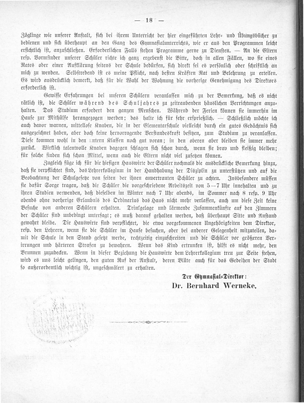 Zugleich füge ich für die hieſigen Hauswirte der Schüler nochmals die ausdrückliche Bemerkung hinzu, daß ſie verpflichtet ſind, das Lehrerkollegium in der Handhabung der Disziplin zu unterſtützen und auf die Beobachtung der Schulgeſetze von ſeiten der ihnen anvertrauten Schüler zu achten. Insbeſondere müſſen ſie dafür Sorge tragen, daß die Schüler die vorgeſchriebene Arbeitszeit von 5—7 Uhr innehalten und zu ihren Studien verwenden, daß dieſelben im Winter nach 7 Uhr abends, im Sommer nach 8 reſp. 9 Uhr abends ohne vorherige Erlaubnis des Ordinarius das Haus nicht mehr verlaſſen, auch um dieſe Zeit keine Beſuche von anderen Schülern erhalten. Trinkgelage und lärmende Zuſammenkünfte auf den Zimmern der Schüler ſind unbedingt unterſagt; es muß darauf gehalten werden, daß überhaupt Sitte und Anſtand gewahrt bleibe. Die Hauswirte ſind verpflichtet, die etwa vorgekommenen Ungehörigkeiten dem Direktor, reſp. den Lehrern, wenn ſie die Schüler im Hauſe beſuchen, oder bei anderer Gelegenheit mitzuteilen, da⸗ mit die Schule in den Stand geſetzt werde, rechtzeitig einzuſchreiten und die Schüler vor größeren Ver⸗ irrungen und härteren Strafen zu bewahren. Wenn das Kind ertrunken iſt, hilft es nicht mehr, den Brunnen zuzudecken. Wenn in dieſer Beziehung die Hauswirte dem Lehrerkollegium treu zur Seite ſtehen, wird es uns leicht gelingen, den guten Ruf der Anſtalt, deren Blüte auch für das Gedeihen der Stadt ſo außerordentlich wichtig iſt, ungeſchmälert zu erhalten.