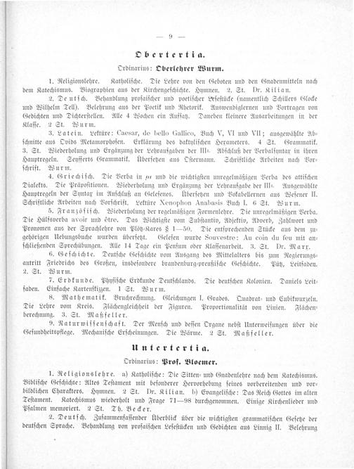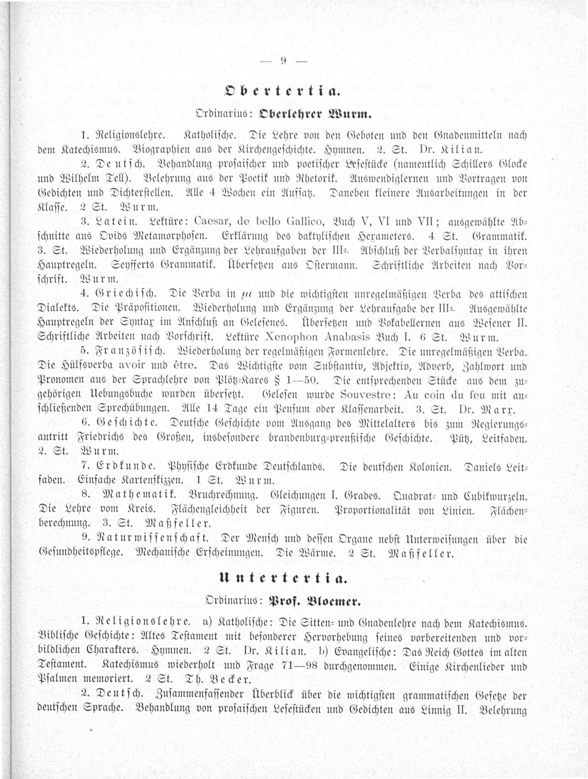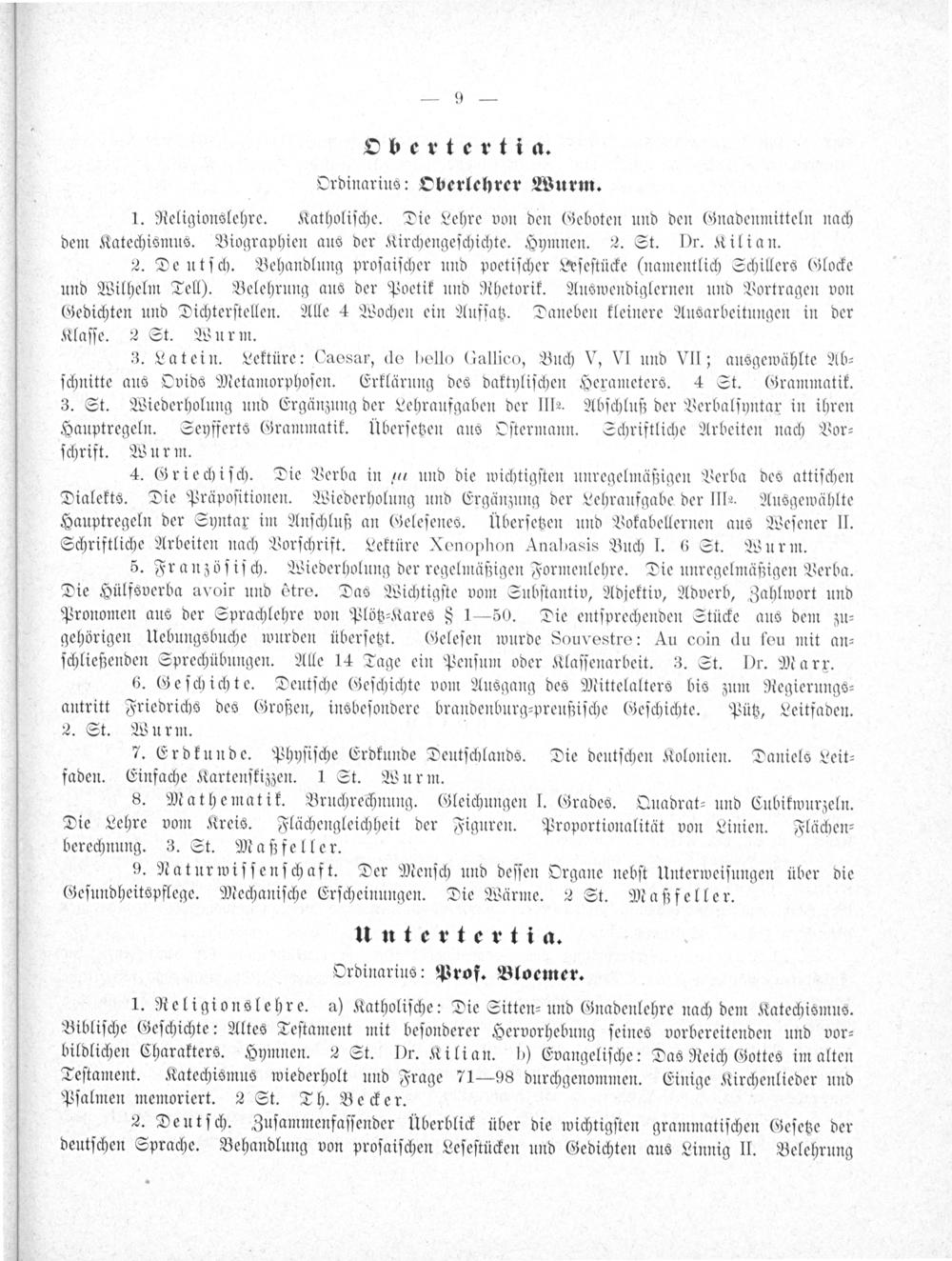 1. Religionslehre. Katholiſche. Die Lehre von den Geboten und den Gnadenmitteln nach dem Katechismus. Biographien aus der Kirchengeſchichte. Hymnen. 2. St. Dr. Kilian.