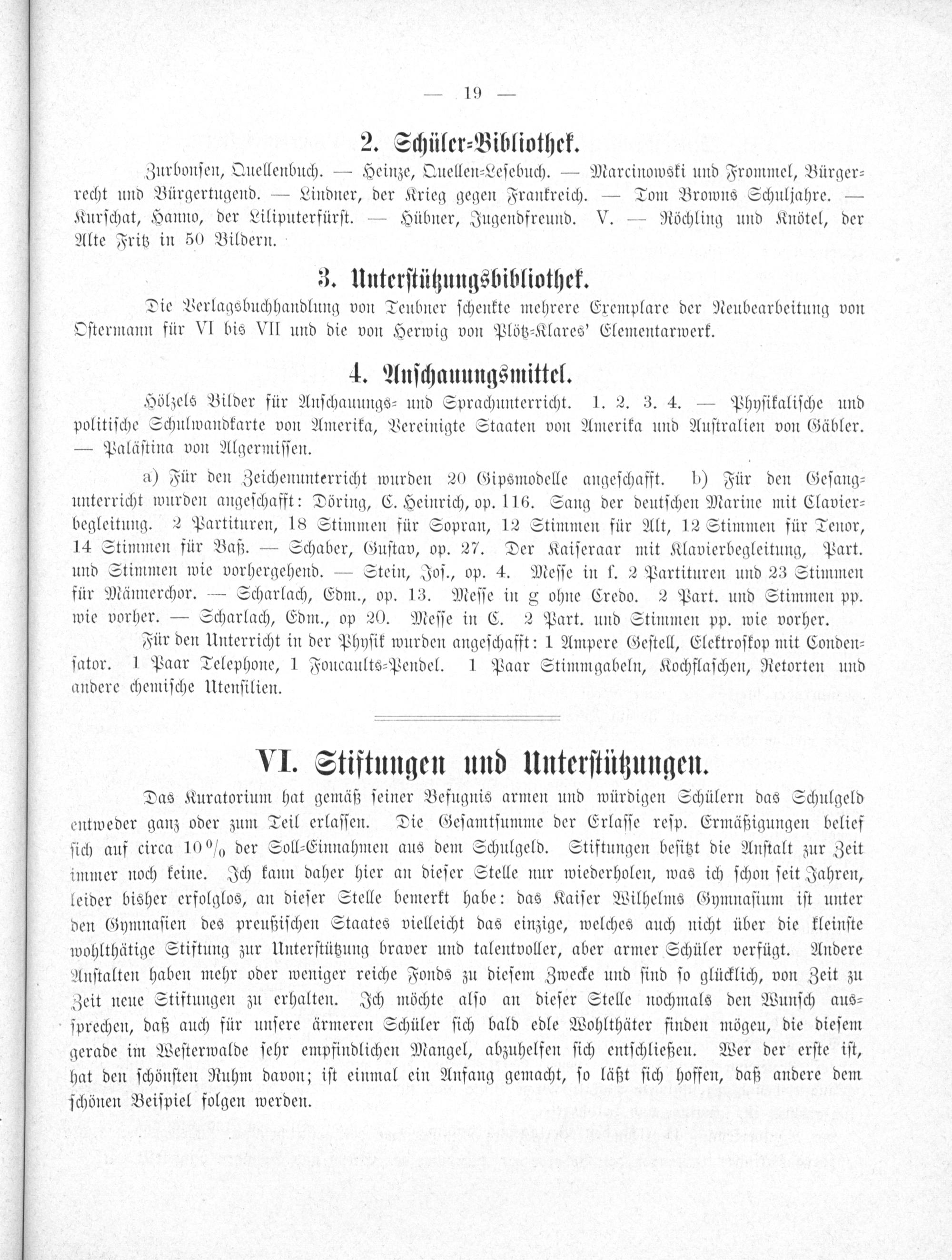 Das Kuratorium hat gemäß ſeiner Befugnis armen und würdigen Schülern das Schulgeld entweder ganz oder zum Teil erlaſſen. Die Geſamtſumme der Erlaſſe reſp. Ermäßigungen belief ſich auf circa 10% der Soll⸗Einnahmen aus dem Schulgeld. Stiftungen beſitzt die Anſtalt zur Zeit immer noch keine. Ich kann daher hier an dieſer Stelle nur wiederholen, was ich ſchon ſeit Jahren, leider bisher erfolglos, an dieſer Stelle bemerkt habe: das Kaiſer Wilhelms Gymnaſium iſt unter den Gymnaſien des preußiſchen Staates vielleicht das einzige, welches auch nicht über die kleinſte wohlthätige Stiftung zur Unterſtützung braver und talentvoller, aber armer Schüler verfügt. Andere Anſtalten haben mehr oder weniger reiche Fonds zu dieſem Zwecke und ſind ſo glücklich, von Zeit zu Zeit neue Stiftungen zu erhalten. Ich möchte alſo an dieſer Stelle nochmals den Wunſch aus⸗ ſprechen, daß auch für unſere ärmeren Schüler ſich bald edle Wohlthäter finden mögeu, die dieſem gerade im Weſterwalde ſehr empfindlichen Mangel, abzuhelfen ſich entſchließen. Wer der erſte iſt, hat den ſchönſten Ruhm davon; iſt einmal ein Anfang gemacht, ſo läßt ſich hoffen, daß andere dem ſchönen Beiſpiel folgen werden.