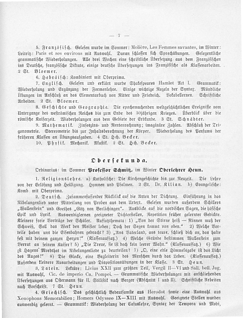 Oberſekunda. Ordinarius: im Sommer Profeſſor Schmitz, im Winter Oberlehrer Heun.