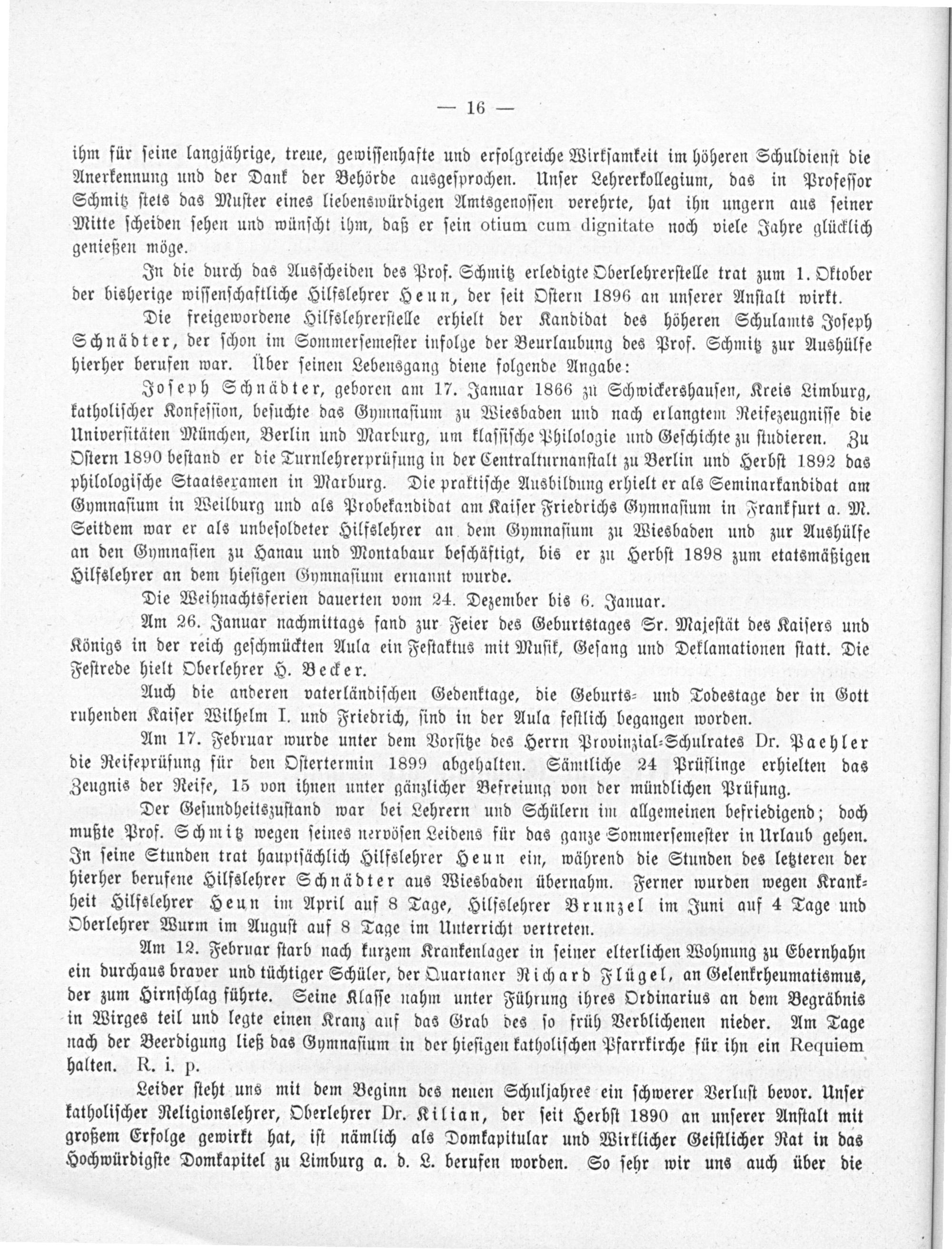 Joſeph Schnädter, geboren am 17. Januar 1866 zu Schwickershauſen, Kreis Limburg, katholiſcher Konfeſſion, beſuchte das Gymnaſium zu Wiesbaden und nach erlangtem Reifezeugniſſe die Univerſitäten München, Berlin und Marburg, um klaſſiſche Philologie und Geſchichte zu ſtudieren. Zu Oſtern 1890 beſtand er die Turnlehrerprüfung in der Centralturnanſtalt zu Berlin und Herbſt 1892 das philologiſche Staatseramen in Marburg. Die praktiſche Ausbildung erhielt er als Seminarkandidat am Gymnaſium in Weilburg und als Probekandidat am Kaiſer Friedrichs Gymnaſium in Frankfurt a. M. Seitdem war er als unbeſoldeter Hilfslehrer an dem Gymnaſium zu Wiesbaden und zur Aushülfe an den Gymnaſien zu Hanau und Montabaur beſchäftigt, bis er zu Herbſt 1898 zum etatsmäßigen Hilfslehrer an dem hieſigen Gymnaſium ernannt wurde.