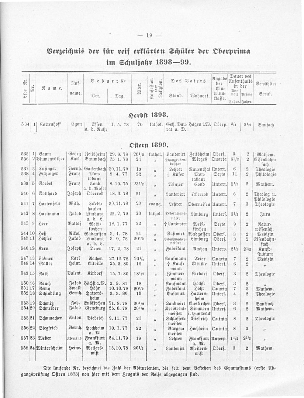 kathol. Landwirt Zeilsheim Oberſ. „ VThongruben⸗ Wirges Quarta beſitzer „ Lehrer RauenthalUntert. „ † Küfer Mon⸗ Serxta tabaur „ Winzer Cond uUuntert. „ Landwirt Oberrod untert. evang. Lehrer Oberneiſen uUntert. kathol. Dekorations⸗ Limburg Unterſ. maler „ † Landwirt Weiß⸗ Serta kirchen „ Gaſtwirt Wadgaſſen Oberſ. „ Schuhmacher⸗ Limburg Oberſ. meiſter 5 Fabrikant Aachen unterp. „ Kaufmann Trier Quarta „ † Kauf⸗ Ettville Untert. mann „ Zimmer⸗ Kirdorf Oberſ. mann „ Kaufmann Höchſt Oberſ. „ Fabrikant Höhr Quarta „ Gaſtwirt Hatters⸗ unterſ. heim „ Landwirt Euskirchen Oberſ. „ Kreisrent⸗ Simmern unterſ. meiſter i. Hunsrück „ Schloſſer⸗ Biebrich[Quinta meiſter „ Bürger⸗ SHochheim Quinta meiſter „ Lehrer Frankfurt unterp. a. M. „ Landwirt Weilers⸗ Oberſ. wiſt