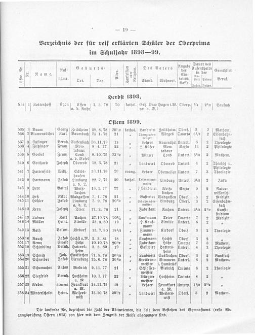 535 1 Baum Georg 536 2 Blumenröther Karl 537 3 Eufinger Bernh. 538 4 Filtzinger Franz 539 5 Goebel Franz 540 6 Gotthard Joſeph 541 7 Hartenfels Wilh. 542 8 Hartmann Jakob 5439 Herr Baltaſ 544 10 Heß Nikol 545 11 Höhler Jakob 54612 Kern Joſeph 54713 Ladner Karl 54814 Müller Heinr. 549 15 Rath Valent. 550]16 Rauch Jakob 551 17 Remy Ewald 55218] Schindling Bernh. 553 19 Schmitz Joh. 554 20 Schneider Jakob 555 21 Schumacher Anton 556 22 Siegfried Bernh. 557 23 Weber Klemens 558 24 Winterſcheidt Heinr.