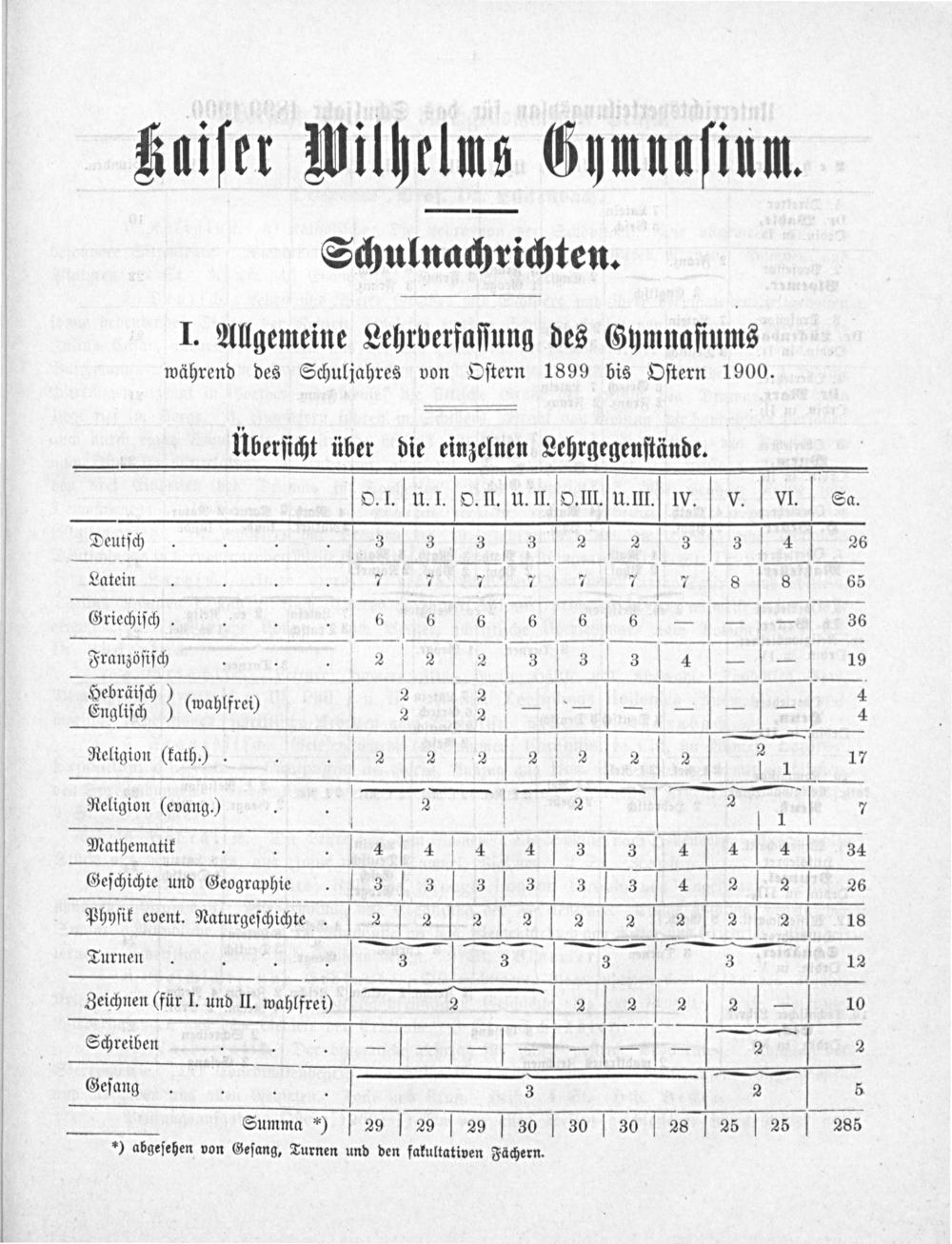 Deutſch 3[3 4 26 Latein s 65 Griechiſch. 6 6 15 Franzöſiſch 2 2 V 3 b 3 4 V—— 19 dans) Gwte) Religion(kath.). V 2 2 2 2 V 2 2 2 1 17 Religion(evang.).. V 2 V 2 7 Mathematik 4 4 4 43 3 4 4 4 34 Geſchichte und Geographie. 3 3 V 3 3 3 3 4 2 2 26 Phyſik event. Naturgeſchichte. 2 2 2 V 2 2 2 2 2 2 18 Turnen 32 73 S3 12 Zeichnen(für I. und II. wahlfrei) 2 2 2 2 2— 10 Schreiben— V—— V———— 2— 2 Geſang 3 3 5 Summa*) ſ 29 ſ 29 ſ⁰ 29 ſ 30 ſ 30 30 28 25 ſ 25 285