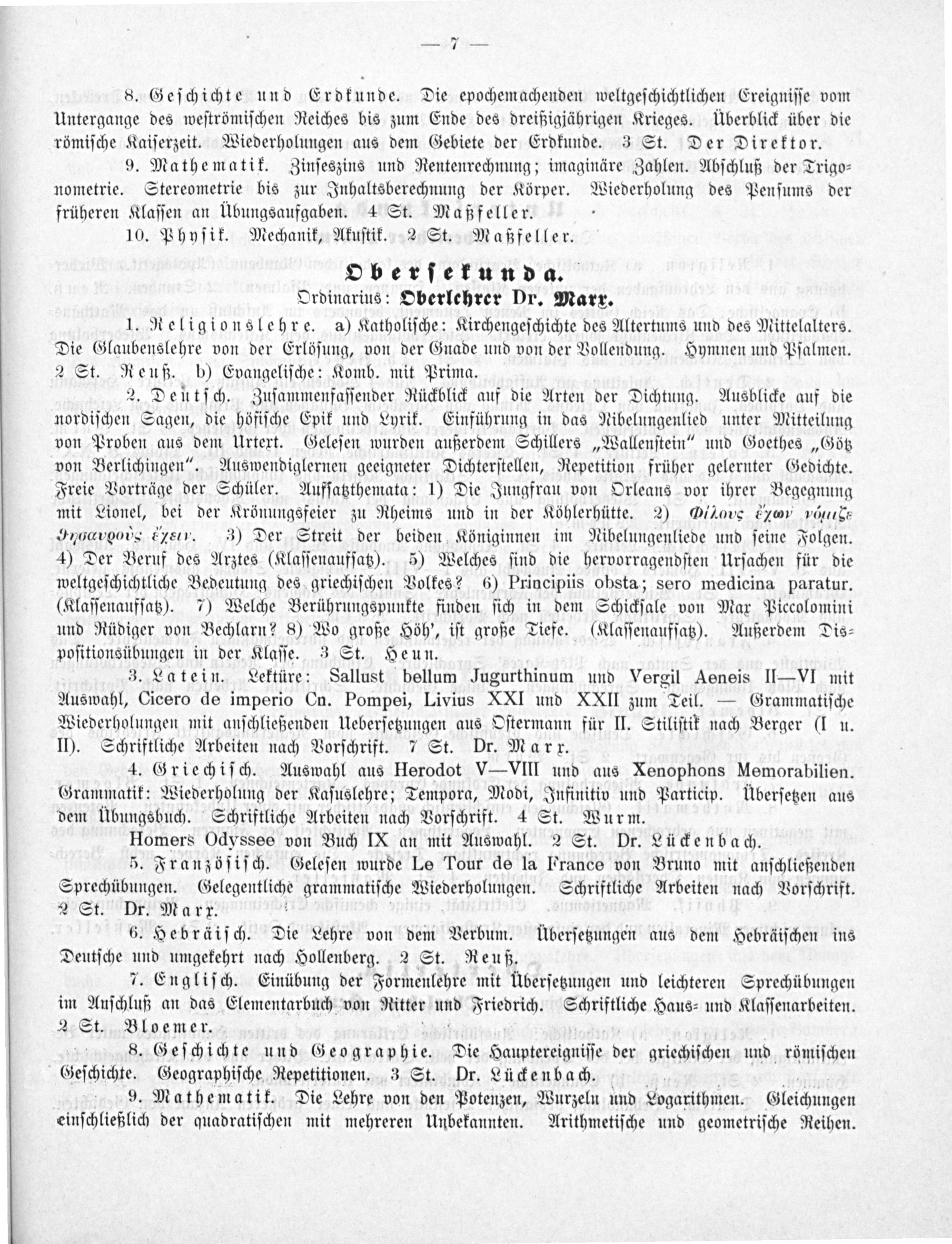 Oberſekunda. Ordinarius: Oberlehrer Dr. Marr. .Religionslehre. a) Katholiſche: Kirchengeſchichte des Altertums und des Mittelalters. Die Ganderaſenn. von der Erlöſung, von der Gnade und von der Vollendung. Hymnen und Pſalmen. 2 St. Reuß. b) Evangeliſche: Komb. mit Prima.