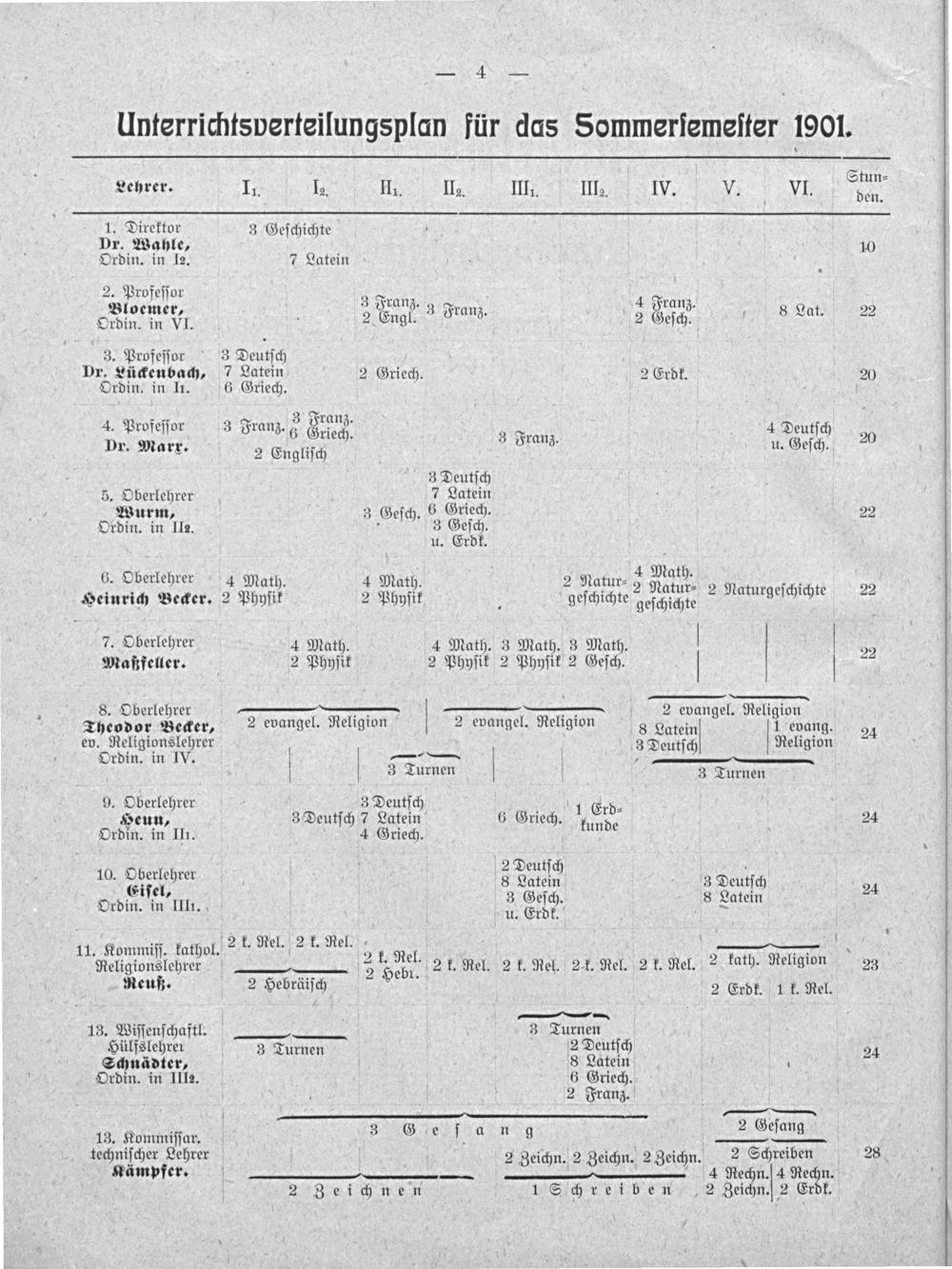 Stun⸗ Lehrer. II. Ia. II. IIe. IIII. IIIe. IV. V. VI. den 1. Direktor 3 Geſchichte 4 Dr. Wahle, 10 Ordin. in l2. 7 Latein 2. Profeſſor 5 Bloemer, 3 Franz. 3 Franz. 4 Franz. 8 Lat. 22