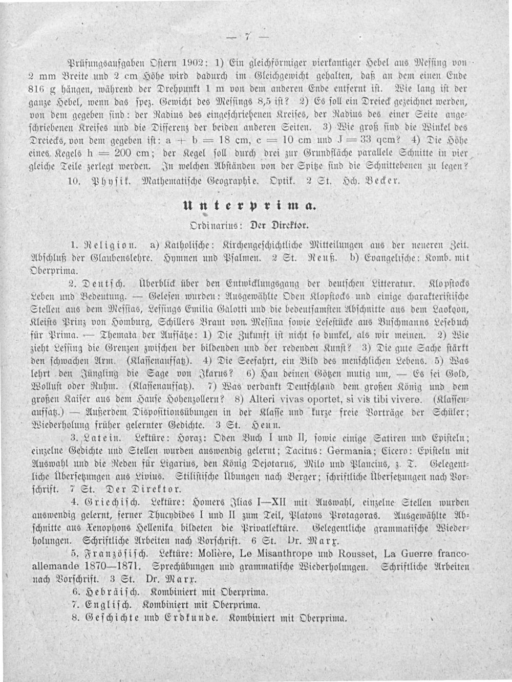 1. Religion. a) Katholiſche: Kirchengeſchichtliche Mitteilungen aus der neueren Zeit. Abſchluß der Glaubenslehre. Hymnen und Pſalmen. 2 St. Reuß. b) ECvangeliſche: Komb. mit Oberprima.