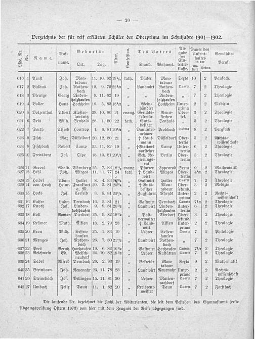 3— An⸗ Dauer des E Ruf⸗ Geburts⸗„ 2 Des Vaters gabe Aufent⸗ Gewählter 3 ☛ Name,. 5 ½ Cir. haltes S name. Ort. Tag. 2 5 Stand. Wohnort. tritts⸗ A der Beruf. 2 klaſſe. ſtalt Prima 616 1] Arnſt Joh. Mon⸗ 11. 10. 82/19 ½ kath. Bäcker Mon⸗ Sexta 10 2 Baufach. tabaur tabaur 617 2 Baldus Joh. Nothen⸗ 19. 9. 79 22 ½„ Landwirt Rothen⸗ Quarta 7 2 Theologie ach bach 3 618 3 Bleutge Georg Linden⸗ 9. 11. 82]19„„ Linden⸗„ 7 2 Theologie holzhauſen holzhauſen 619 4 Boller Hans Hochheim 19. 5. 83/18 ½„ Wein⸗ Hochheim Unter⸗ 2 2 Medizin händler prima 620 56 Bolzenthal Albert Kloöſter⸗ 29. 10. 80 21 ſevang. Gerichts⸗-⸗ Neun⸗ Ober⸗ 3 2 Theologie lausnitz ſekretär kirchen ſek. 621 6 Deis Wilh. Senhals 28. 1. 80 22 kath. bnts⸗ Senhals„ 3 2 Theologie eſitzer 622 7 Dorth. Alfred Höntrop 1. 6. 81 20 ½ ¹⁄„ Bauunter⸗ Probbach Quinta 8 2 Bergfach nehmer. 623 8 Fiſch Max Düſſeldorf 20. 12. 80] 21„ † Kauf⸗(Düſſeldorf Ober⸗ 5 2 Rechts⸗ mann tertia wiſſenſchaft 624 9 Fiſchbach Robert Camp(25. 11. 82 19„(†Stations⸗- Camp Unter⸗ 6 2 Theologie vorſteher tertia 625[10 Freusberg Joſ. Olpe 18. 10. 81 20 ½„ Geh. Re⸗ Berlin Ober⸗ 5 2 Theologie gierungs⸗ tertia rat 626/11 Grevel Adalb. Dörnbergſ25. 7. 83,18 ⅛ evang. Pfarrer Eppenrod Sextaſ 9 2 Mathematik 62712 Hehl Joh. Wirges[11. 11. 77) 24 kath. †+ Land⸗ Wirges Ober⸗ 4 ½ 2 Theologie . wirt tertia 628]13 Heibel Adam Holler 8. 4. 83/1833à¼0„ Gaſtwirt Holler Quarta 7 2 Theologie 629 14 von Heuß Heinr. Frankfurt 29. 3. 81 20 ¾˖ 3„ †+ Guts⸗ Mon⸗ Ober⸗ 3 2 Medizin a. M. beſitzer tabaur ſſekund. 630[15 Hocks Joſ. Crefeld 3. 5. 81/20 àX¾„ Zugführer, Rheydt Unter⸗ 2 2 Rechts⸗ 4— prima wiſſenſchaft 63116 Kaiſer Ludw. Dernbach 16. 2. 81] 21. 4 Gaſtwirt Dernbach Quarta 71 2½ 2 Theologie 63217 Knoth Joſ. Linden⸗ 9. 9. 81 20 ½„ Landwirt Linden⸗ Unter⸗ 6 2 Theologie holzhauſen holzhauſen tertia 1 633718 Koll Roman Dierdorf 25. 9. 82191 ½„ Poſt⸗ Dierdorf Ober⸗ 3 2 CTheologie verwalter ſekund. 634/19] Krämer Math. Alflen 18. 2. 790) 23I„* Land⸗ Alflen Unter⸗ 2 2 Theologie wirt prima 635 20 Kron Wilh. Seſſen⸗ 25. 1. 83 19„ Lehrer Seſſen⸗ Quarta 7 2 Philologie hauſen hauſen 636 21 Menges Joh. Rothen, 26. 7. 80,21 ½ ⁄„ Landwirt Rothen⸗„ 7 2 Theologie a ba 637 22 Pees Bernh. Horhauſen 19. 6. 82 19 ½ ⁄6„ Gaſtwirt Holuhſen Quinta 71 ½ 2 Theologie 638 23 Reichwein Ed. Welſch⸗ 24. 10. 82 191½2„ Lehrer Naſtätten Quarta 7 2 CTheologie neudorf 639724 Sabel Alfred Dernbach 26. 2. 83 19„ Sekretär Meon. Sexta 9 2 Mathematik tabaur 640 35 GSteinborn Joh. Neuenahr 23. 11. 78ſ/ 236„ Landwirt Neuenahr Unter⸗ 2 2 Rechts⸗ prima wiſſenſchaft 641 26 Steinebach Joſ. Bellingen 15. 11. 81 20„ Lehrer Maer Quarta 7 2 Theologie rachdor 642 27 Umbach Felir Daun 11. 1. 82] 20„ Perisreitt Daun Ouarta 7 2 Forſtfach meiſter