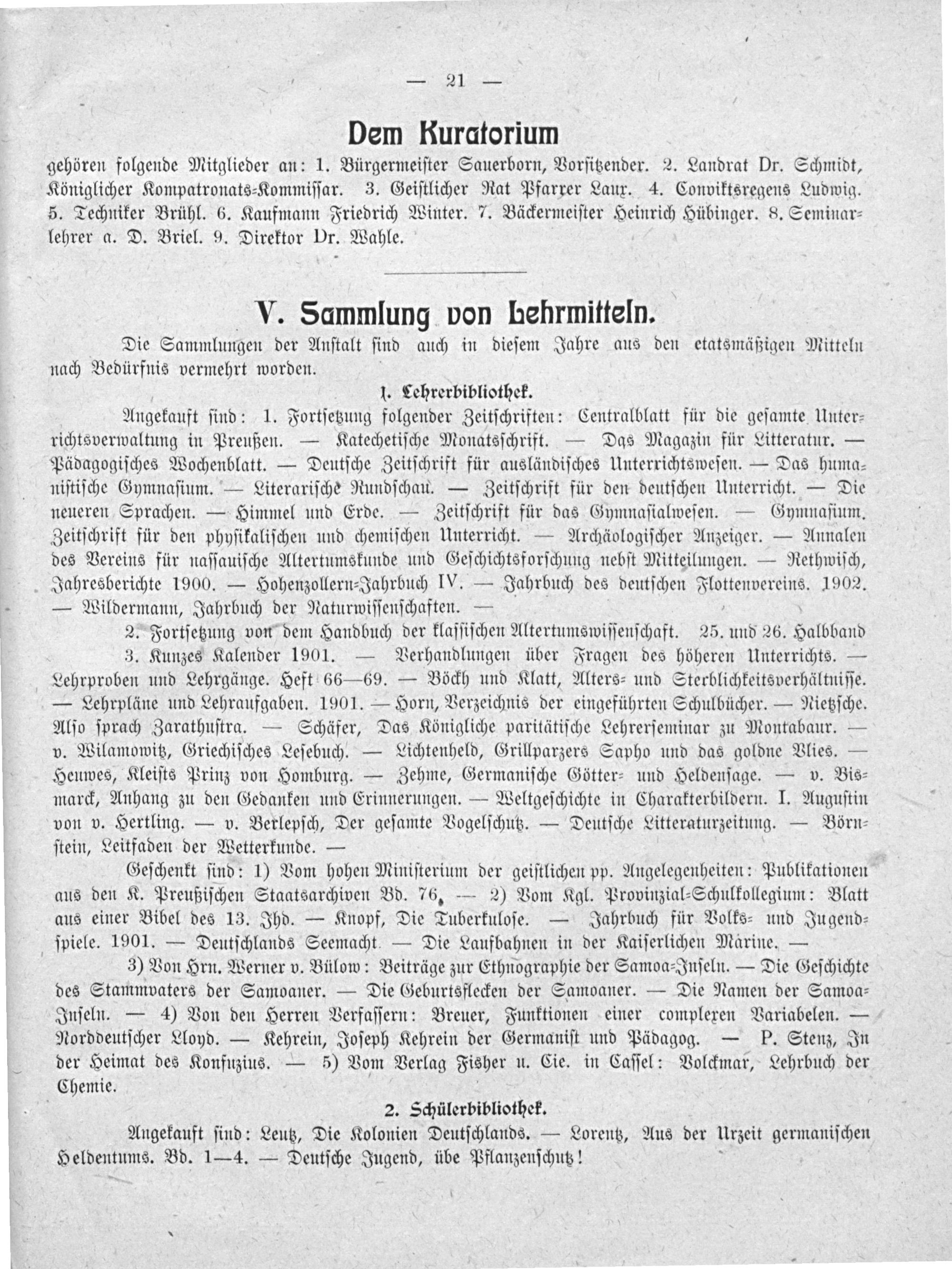 Dem Kuratorium gehören folgende Mitglieder an: 1. Bürgermeiſter Sauerborn, Vorſitzender. 2. Landrat Dr. Schmidt, Königlicher Kompatronats⸗Kommiſſar. 3. Geiſtlicher Rat Pfarrer Laux. 4. Conviktsregens Ludwig. 5. Techniker Brühl. 6. Kaufmann Friedrich Winter. 7. Bäckermeiſter Heinrich Hübinger. 8. Seminar⸗ lehrer a. D. Briel. 9. Direktor Dr. Wahle.