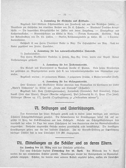 5. Sammlung für den FZeichenunterricht. Die Moſaik⸗ und Plattenfabrik in Ransbach ſchenkte 47 Platten. Vom hohen Miniſterium der geiſtlichen pp. Angelegenheiten wurde Heft II. des Lehrmittelverzeichniſſes dem Gymnaſium zuge⸗