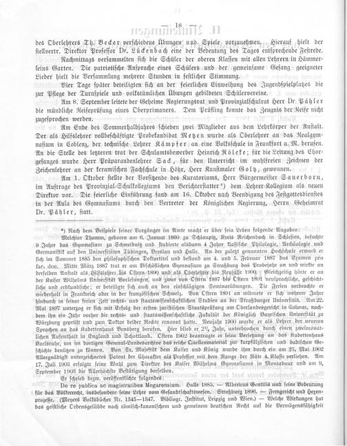 Am 1. Oktober ſtellte der Vorſitzende des Kuratoriums, Herr Bürgermeiſter Sauerborn, im Auftrage des Provinzial⸗Schulkollegiums den Berichterſtatter*) dem Lehrer⸗Kollegium als neuen Direktor vor. Die feierliche Einführung fand am 16. Oktober nach Beendigung des Feſtgottesdienſtes in der Aula des Gymnaſiums durch den Vertreter der Königlichen Regierung, Herrn Geheimrat Dr. Pähler, ſtatt.