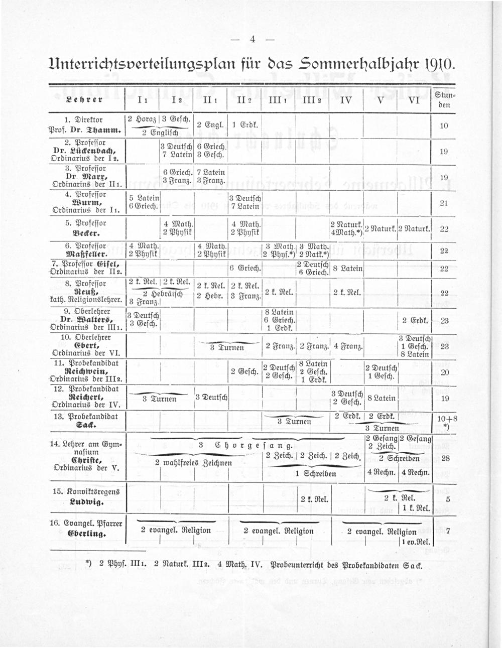 Stun⸗ Lehrer 11 V 1² III V II 2 V III III 2 IV V V VI den 1. Direktor 2 Horaz 3 Geſch. 2 Engl. V 1 Erdk. 10 Prof. Dr. Thamm. 2 Engliſch 2. Profeſſor 3 Deutſch 6 Griech V Dr. Lückenbach 3 19 Ordinarius der 12. 7 Latein] 3 Geſch. 3. Profeſſor 6 Griech. 7 Latein Dr. Marxr 8 19 Ordinarins der III. 3 Franz. 3 Franz. 4. Profeſſor 5 Latein 3 Deutſch V Wurm. 1 21 Ordinarius der I1. 6Griech. 7 Latein 5. Profeſſor 4 Math. 4 Math. 2 Naturk. turk. 2 Naturk. 22 Becker. 2 Phyſik 2 Phyſik 4RNa h.-) daturt, 2 Natur 2 6. Profeſſor 4 Math.) 4 Math. 3 Math. 3 Math. V V 2² Maßfeller. 2 Pöyſik 2 Phyſit 2 Phvl) 2 Natke 7. Profeſſor Eiſel; 2 Deutſch. Ordinarius der II2. V 6 Griech. 6 Griech. V 8 Latein V 22 8. Profeſſor ſ k. Rel. 2k. Rel. 2 1. Rel. 2 k Rel. V Reuß 2 Hebrän 2 k. Rel. 12 k. Nel. 22 kath. Religionslehrer. 3— räiſch 2 Hebr. 3 Franz. Dr. Walthre s Deutſch V 5 Brbein V 2 Erdk. 23 Ordinarius der IIII. eſch— 1 Erdk.— 10. Oberlehrer; 3 Deutſch Or i Lbert, V V——3 Turnen 2 Franz. 2 Fran 4 Franz. 2 Geſch. 23 rdinarius der VI. 11. Probekandidat 2 Deutſch 8 Latein 2 Deutſch Reichwein 2 Geſch. 2 Geſch. 20 Ordinarius der IIIa. 2 Geſch. 1 Erdk. 1 Geſch. 12. Probekandidat 3 Deutſch Reichert 3 T 3 Deutſch 8 Lotein 19 Ordinarius der IV. urnen 4 Geſch. 13. Woerndihst e 2 Erdk. nne dſ . n 2 Geſang 2 Geſang 14. Lehrue am Gym⸗ 3 Chorgeſang. 2 Zeich. vaſium——*.2 Zeich. 12 Zeich. 12 Zeich 2 Schreiben 28 Chriſte, 2 wahlfreies Zeichnen chreiben Ordinarius der V. 1 Schreiben 4 Rechn. 4 Rechn. 15. Konviktsregens 2 2 k. Rel. Ludwig. V V V 2 nel(TLRe. 16. Evangel. Pfarrer 7. 1 Eberling. 2 äel ne in 2 Bandel dien 2 evangel. Religion 7