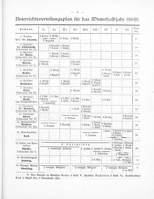 Stun⸗ Lehrer. 1i I I fie III1 SII!: V IVIV VI dun 2 Horaz 3 Geſch. 11. Direktor 2 bons—2 Engl. 2 Geſch. V 1 Prof. Dr. Thamm. 2 Engliſch 2. Profeſſor 3 Deutſch 6 Griech Dr. Lückenbach Latein 3 Geſch. 19 Ordinarius der 12. 7Latein V 3 Geſch. V V 3. Profeſſor 6 Griech 7 Latein Dr. Marxr 2 3/4 V 19 Ordinarius der II1. s Franz. 3 Franz. V 4. Profeſſor 5 Latein 3 Deutſch Wurm 34( 4 21 Ordinarius der 11. 6 Griech. V 7 Latein e 5 4 Mat 4 Math. 5. Profeſſor 4 Math. aih b ath 2 Natur⸗ 2 Natur⸗ 22 BPecker⸗ 2 ik 2 Pzyſif 2 Ratur⸗ kunde ktunde 4 Ordinarius der IV. V Phyſi*) tunde 6. Profeſor ſ4 Math. 14 Math. 3 Mat. 26 Math. 22 Maßfeller. 2 Phyſik 2 Phyſik[2 Phyſik rundon) V 7. Profeſſor S, Piſiei V 8 Griech. 2 deuuſc S Latein 22 Ordinarins der II2;* 8. Profeſſor 2 k. Rel. 2 k. Rel. Reuß⸗ 3 Franz. 2 ddar 2.ar V 2 k. Rel V 2 k. Rel. 22 kath. Religionslehrer. 2 Hebrälſch 3 V V D. Watters, Deulſch 1eret bebte V V V 23 Ordinarius der IIIi. ³ Geſch. 1 6 Griech. 10. Oberlehrer 7' 2 Franz. ſ Deutſch Ebert 5. 2 Franz. 4 Jranz. eut 23 Ordinarius der VI. 3 Turnen 1 Erdk. 8 Latein 11. Probekandidat(8 Latein —. 3 Deutſch Reichert 3 Deutſch 2 Geſch. ² Geſch. 24 Ordinarius der IIle. 3 Turnen(1 Erdk. 2 Geſch. 2 Erdk. 8 Latein*) 2 Erdk. 12. Probekandidat— Er 1)et 22 Erdt 24 3 Turnen*) 2 Erdk. 5 Sack.—. 3 Turnen . 1 2 Geſang 2 Geſang Ia. Lehrerfim Gym Kargeſang 2 Zeichn 4 Rechn. Chriſte, 2 wahlfreies Zeichnen 2 Beichn.⸗ Zeichn. 2 Zeichn. 2 Wui 1 Geſch. 28 Ordinarius der V. V Schreiben 2 areben 14. Konviktsregens 7 2 k. Rel. 2 kath. Religion 5 Ludwig. V V 2d 1 Kel . 15 Leubel Piarrer 2 evangel. Religion 2 evangel. Religion V 2 evangel. Religion 7 erlns; V V ſl ev. Rel.