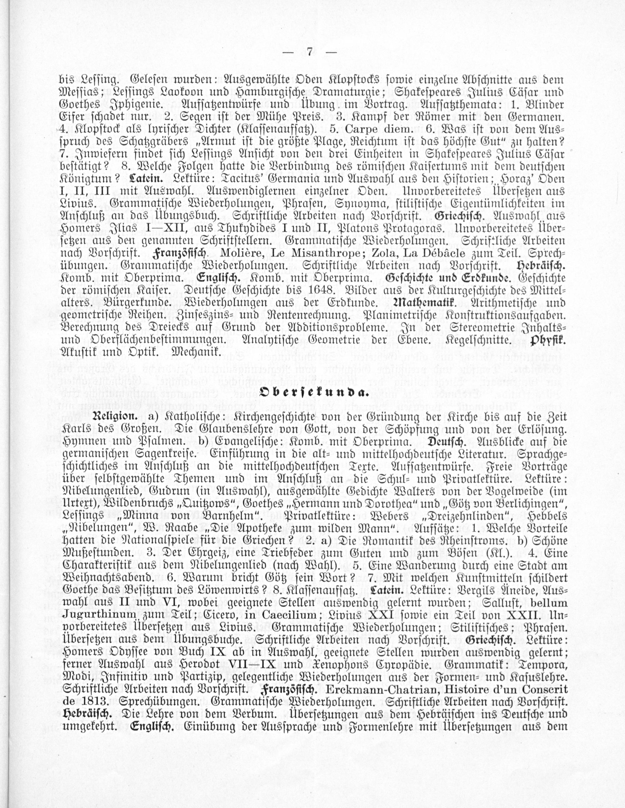 Religion. a) Katholiſche: Kirchengeſchichte von der Gründung der Kirche bis auf die Zeit Karls des Großen. Die Glaubenslehre von Gott, von der Schöpfung und von der Erlöſung. Hymnen und Pſalmen. b) Evangeliſche: Komb. mit Oberprima. Deutſch. Ausblicke auf die germaniſchen Sagenkreiſe. Einführung in die alt- und mittelhochdeutſche Literatur. Sprachge⸗ ſchichtliches im Anſchluß an die mittelhochdeutſchen Texte. Aufſatzentwürfe. Freie Vorträge über ſelbſtgewählte Themen und im Anſchluß an die Schul⸗ und Privatlektüre. Lektüre: Nibelungenlied, Gudrun(in Auswahl), ausgewählte Gedichte Walters von der Vogelweide(im Urtext), Wildenbruchs„Quitzows“, Goethes„Hermann und Dorothea“ und„Götz von Berlichingen“, Leſſings„Minna von Barnhelm“. Privatlektüre: Webers„Dreizehnlinden“, Hebbels „Nibelungen“, W. Raabe„Die Apotheke zum wilden Mann“. Aufſätze: 1. Welche Vorteile hatten die Nationalſpiele für die Griechen? 2. a) Die Romantik des Rheinſtroms. b) Schöne Mußeſtunden. 3. Der Ehrgeiz, eine Triebfeder zum Guten und zum Böſen(Kl.). 4. Eine Charakteriſtik aus dem Nibelungenlied(nach Wahl). 5. Eine Wanderung durch eine Stadt am Weihnachtsabend. 6. Warum bricht Götz ſein Wort? 7. Mit welchen Kunſtmitteln ſchildert Goethe das Beſitztum des Löwenwirts? 8. Klaſſenaufſatz. Latein. Lektüre: Vergils Äneide, Aus⸗ wahl aus II und VI, wobei geeignete Stellen auswendig gelernt wurden; Salluſt, bellum Jugurthinum zum Teil; Cicero, in Caecilium; Livius XXI ſowie ein Teil von XXII. Un⸗ vorbereitetes UÜberſetzen aus Livius. Grammatiſche Wiederholungen; Stiliſtiſches; Phraſen. lüberſetzen aus dem Übungsbuche. Schriftliche Arbeiten nach Vorſchrift. Griechiſch. Lektüre: Homers Odyſſee von Buch IX ab in Auswahl, geeignete Stellen wurden auswendig gelernt; ferner Auswahl aus Herodot VII—IX und Xenophons Cyropädie. Grammatik: Tempora, Modi, Infinitiv und Partizip, gelegentliche Wiederholungen aus der Formen⸗ und Kaſuslehre. Schriftliche Arbeiten nach Vorſchrift. Franzöſiſch. Ereckmann-Chatrian, Histoire d'un Conscrit de 1813. Sprechübungen. Grammatiſche Wiederholungen. Schriftliche Arbeiten nach Vorſchrift. hebräiſch. Die Lehre von dem Verbum. Überſetzungen aus dem Hebräiſchen ins Deutſche und umgekehrt. Engliſch. Einübung der Ausſprache und Formenlehre mit Überſetzungen aus dem