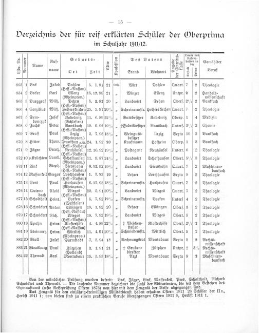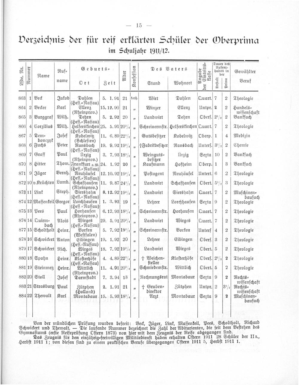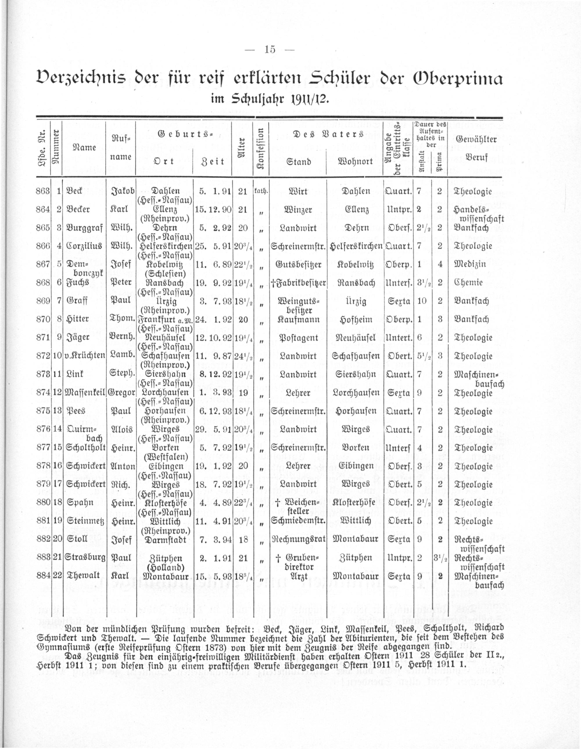 1. Daner des 1.28 ufent 1 Ruf⸗ Geburts 5 8 Des Vaters 5*α 2 heites in Gewählter . e— S 8 5 di name 5* 88* 5 Beruf Sſe. Ort Zeit Stand Wohnort 8 2 8 8 863 1 Beck Jakob Dahlen 5. 1. 91 21 fath. Wirt Dahlen Quart. 7 2 CTheologie (Heſſ.⸗Naſſau) 864 2 Becker Karl Ellenz ſ15. 12. 9021„ Winzer Ellenz Untpr. 2 2 Handels⸗ (Rheinprov.) wiſſenſchaft 8653 Burggraf Wilh. Deurn 5. 2. 92 20„ Landwirt Dehrn Oberſ. 2 ½ 2 Bankfach (Heſſ.⸗Naſſau) 866 4 Corzilius Wilh. Helfeegkchen 25. 5. 91 20 ¾„ Schreinermſtr. Helferskirchen Quart. 7 2 Theologie (Heſſ.⸗Naſſau 867 5 Dem⸗ Joſef Kobelwitz[11. 6. 89 22 ½„ Gutsbeſitzer Kobelwitz Oberp. 1 4 Medizin bonczyk(Schleſien)— 868 6 Fuchs Peter Mauybach 19. 9.92/19 ¼„†Fabrikbeſitzer Ransbach Unterſ. 3 ½ 2 Chemie (Heſſe⸗ Naſſau) 4 869 7 Graff Paul Ürzig 3. 7.93 18 ½„ Weinguts⸗ Ürzig Sexta 10 2 Bankfach (Rheinprov.) beſitzer 870 8 Hitter Thom. neie a. M. 24. 1.927/ 20„ Kaufmann Hofheim Oberp. 1 3 Bankfach .(Heſſ.⸗Naſſau) 8719 Jäger Bernh. Meuhüne Jie. 10. 92 19„ Poſtagent Neuhäuſel Untert. 6 2 Theologie eſſ.⸗Naſſaul 872 10 v. Krüchten Lamb. Schofbauſen 11. 9. 87 24 ½„ Landwirt Schafhauſen Obert. 5 ½ 3 Theologie (Rheinprov.) 873 11 Link Steph. Siershahn 8. 12. 92/19 ½„ Landwirt Siershahn Quart.7 2 Maſchinen⸗ (Heſſ.⸗Naſſau) baufach 874 12 Maſſenkeil Gregor Lorchhauſen 1. 3. 93] 19„ Lehrer Lorchhauſen Sextaſt9 2 Theologie (Heſſ⸗Naſſau) 875 13 Pees Paul Horhauſen 6. 12. 93 18 ¼„Schreinermſtr. Horhauſen[Quart. 7 2 Theologie (Rheinprov.) 876 14(Quirm⸗ Alois Wirges(29. 5. 9120 ¾, Landwirt Wirges Quart. 7 2 Thoologie bach(Heff.⸗Naſſau) 877 /15 Scholtholt Heinr. rhele— 5. 7. 9219 ½„Schreinermſtr. B Borken Unterſ 4[2 Theologie (Weſtfalen 878 16 Schwickert Anton Eibingen ſi9. 1. 92 20„ Lehrer Eibingen Oberſ. 3 2 CTheologie (Heſſ.⸗Naſſau) 879 17 Schwickert Rich. 8 Pmaſ 18. 7. 92 19 ½„ Landwirt Wirges Obert. 5 2 CTheologie (deſſ⸗Naſſau) 880 18 Spahn Heinr. Kloſterhöfe 4. 4. 89/22 ¾„* Weichen⸗ Kloſterhöfe Oberſ. 2 ½/ 2 Theologie (Heſſ⸗Naſſau) ſteller 88119 Steinmetz Heinr. Wittlich ſ11. 4.91 20 ¾„Schmiedemſtr. Wittlich Obert. 5 2 Theologie Rheinprov.) 882 20 Stoll Joſef(Der nßend 7. 3. 94 18„ Rechnungsrat Montabaur Sexta 9 2 Rechts⸗ wiſſenſchaft 883˙21 Strasburg Paul Zütphen 2. 1.91 21„ † Gruben⸗ Zütphen Untpr. 2 3 ½ Rechts⸗ 3 (Holland) direktor wiſſenſchaft 884 22 Thewalt Karl Montabaur 15. 5.93 18 ¾„ Arzt Montabaur Sexta 9 2 Maſchine baufa
