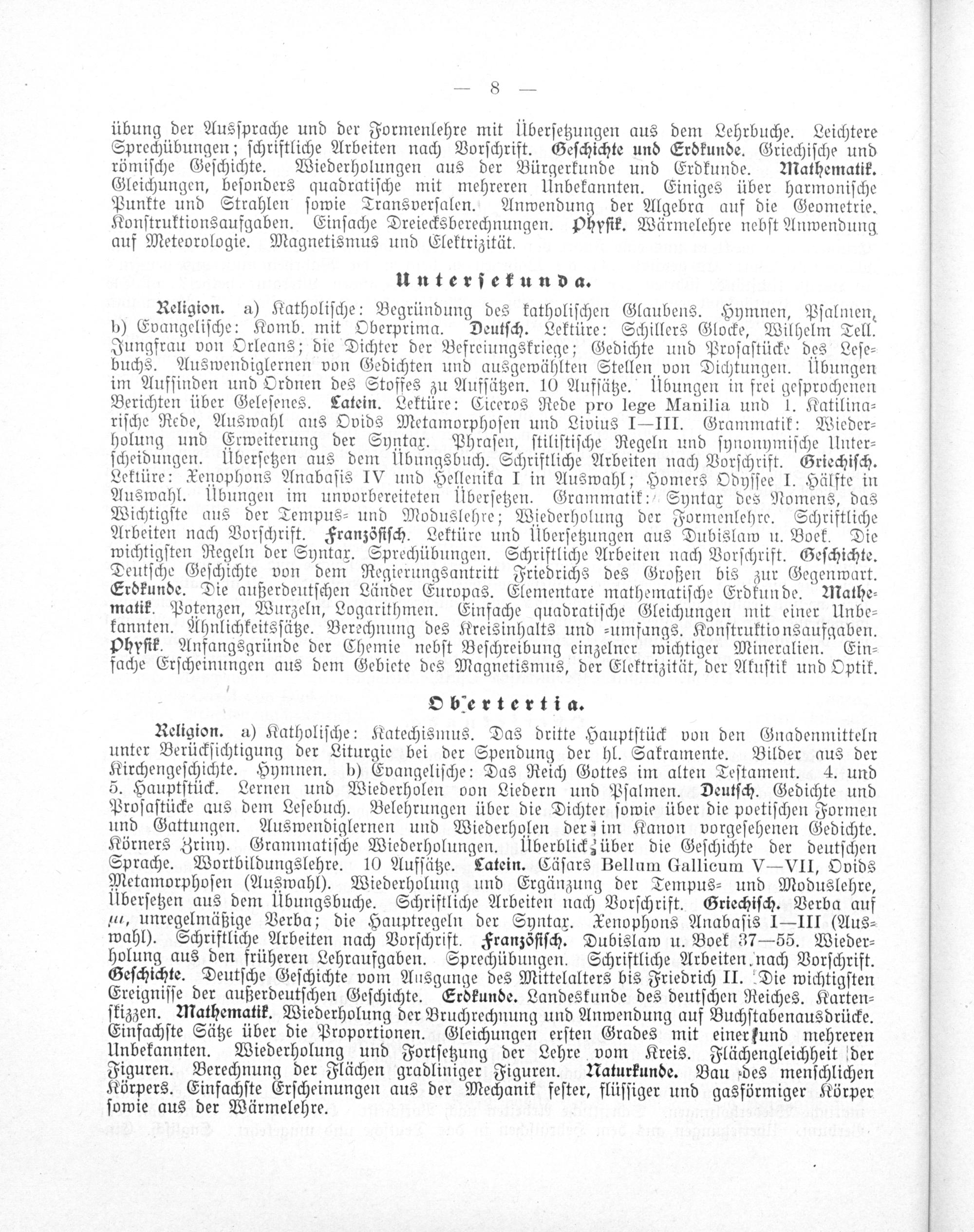 übung der Ausſprache und der Formenlehre mit Überſetzungen aus dem Lehrbuche. Leichtere Sprechübungen; ſchriftliche Arbeiten nach Vorſchrift. Geſchichte und Erdkunde. Griechiſche und römiſche Geſchichte. Wiederholungen aus der Bürgerkunde und Erdkunde. Mathematik. Gleichungen, beſonders quadratiſche mit mehreren Unbekannten. Einiges über harmoniſche Punkte und Strahlen ſowie Transverſalen. Anwendung der Algebra auf die Geometrie. Konſtruktionsaufgaben. Einſache Dreiecksberechnungen. Phyſik. Wärmelehre nebſt Anwendung auf Meteorologie. Magnetismus und Elektrizität.