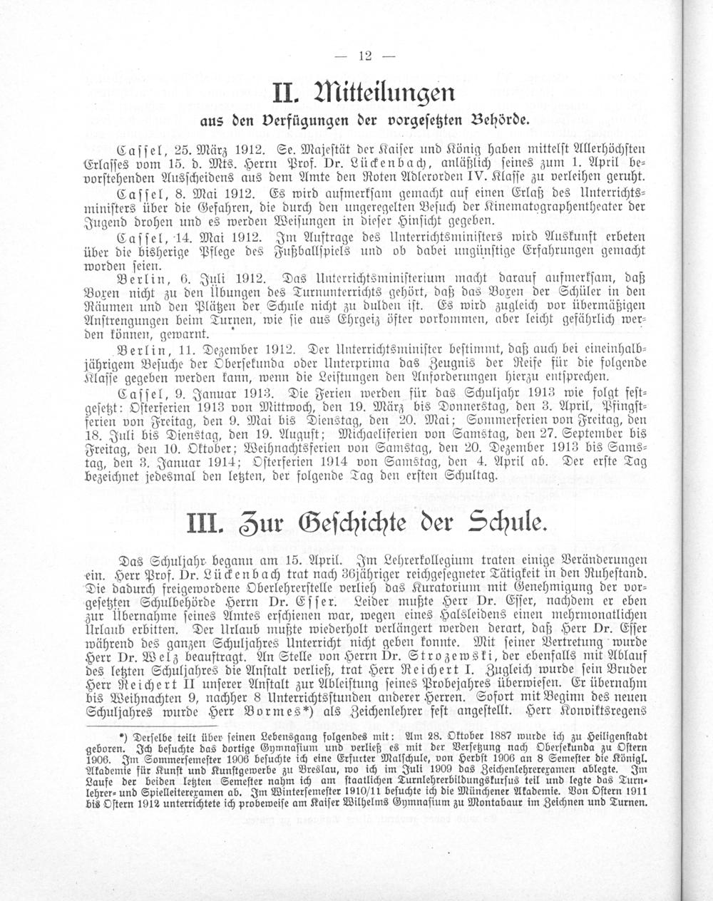 *) Derſelbe teilt über ſeinen Lebensgang folgendes mit: Am 28. Oktober 1887 wurde ich zu Heiligenſtadt geboren. Ich beſuchte das dortige Gymnaſium und verließ es mit der Verſetzung nach Oberſekunda zu Oſtern 1906. Im Sommerſemeſter 1906 beſuchte ich eine Erfurter Malſchule, von Herbſt 1906 an 8 Semeſter die Königl. Akademie für Kunſt und Kunſtgewerbe zu Breslau, wo ich im Juli 1909 das Zeichenlehrerexamen ablegte. Im Laufe der beiden letzten Semeſter nahm ich am ſtaatlichen Turnlehrerbildungskurſus teil und legte das Turn⸗ lehrer⸗ und Spielleiterexamen ab. Im Winterſemeſter 1910/11 beſuchte ich die Münchener Akademie. Von Oſtern 1911 bis Oſtern 1912 unterrichtete ich probeweiſe am Kaiſer Wilhelms Gymnaſium zu Montabaur im Zeichnen und Turnen.