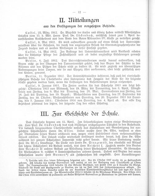 Das Schuljahr begann am 15. April. Im Lehrerkollegium traten einige Veränderungen ein. Herr Prof. Dr. Lückenbach trat nach 36jähriger reichgeſegneter Tätigkeit in den Ruheſtand. Die dadurch freigewordene Oberlehrerſtelle verlieh das Kuratorium mit Genehmigung der vor⸗ geſetzten Schulbehörde Herrn Dr. Eſſer. Leider mußte Herr Dr. Eſſer, nachdem er eben zur Übernahme ſeines Amtes erſchienen war, wegen eines Halsleidens einen mehrmonatlichen Urlaub erbitten. Der Urlaub mußte wiederholt verlängert werden derart, daß Herr Dr. Eſſer während des ganzen Schuljahres Unterricht nicht geben konnte. Mit ſeiner Vertretung wurde Herr Dr. Welz beauftragt. An Stelle von Herrn Dr. Strozewski, der ebenfalls mit Ablauf des letzten Schuljahres die Anſtalt verließ, trat Herr Reichert I. Zugleich wurde ſein Bruder Herr Reichert II unſerer Anſtalt zur Ableiſtung ſeines Probejahres überwieſen. Er übernahm bis Weihnachten 9, nachher 8 Unterrichtsſtunden anderer Herren. Sofort mit Beginn des neuen Schuljahres wurde Herr Bormes“:) als Zeichenlehrer feſt angeſtellt. Herr Konviktsregens