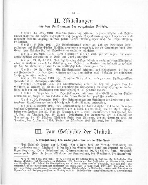 *) Profeſſor Dr. Martin Jöris, geboren am 26. Oktober 1865 zu Berſitten, Kr. Geilenkirchen, Bez. Aachen, abſolvierte das Gymnaſium zu Paderborn 1886, ſtudierte auf den Hochſchulen zu Münſter i. W., Bonn und Straßburg i. E.; beſtand die Staatsprüfung am 1. und 2. März 1895 in Straßburg, war von 1895—1897 Probekandidat und Wiſſenſchaftlicher Hilfslehrer am Gymnaſium in Schlettſtadt, 1897— 1901 Oberlehrer an der mit einem Lehrerinnen⸗Seminar verbundenen höheren Mädchenſchule in Mülhauſen, 1901—1903 Oberlehrer am Gymnaſium und Realprogymnaſium in Limburg a. d. L. Viſſenſchaftliche Veröffentlichungen: 1. Unterſuchungen