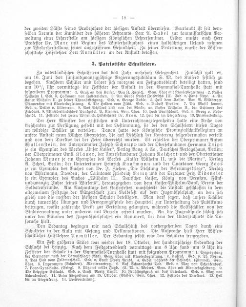 Zu vaterländiſchen Schulfeiern bot das Jahr mehrfach Gelegenheit. Zunächſt galt es, am 16. Juni das fünfundzwanzigjährige Regierungsjubiläum S. M. des Kaiſers feſtlich zu begehen. Nachdem Schüler und Lehrer ſich morgens am Feſtgottesdienſt beteiligt hatten, fand um 10 ¾ Uhr vormittags die Feſtfeier der Anſtalt in der Gymnaſial⸗Turnhalle ſtatt mit folgendem Programm: 1. Gruß an den Kaiſer. Von F. Zureich. Gem. Chor mit Klavierbegleitung 2. Kaiſer Wilhelm I. Ged. v. Hoffmann von Fallersleben. 3. Am Grabe Kaiſer Friedrichs III. Ged v. Hans Netze. 4. An Kaiſer Wilhelm II. zu ſeiner Thronbeſteigung. Ged. v. George Tuble. 5. Heil dem Kaiſer. Von A. Wiltberger. Männerchor mit Klavierbegleitung. 6. Die Helden vom Iltis. Ged. v. Rudolf Presber. 7. Die Muſik kommt. Ged. v. Detlev v. Liliencron. 8. Aus Schillers Lied von der Glocke; an Kaiſer Wilhelm II., den Schirmer des Friedens. 9. Altniederländiſches Dankgebet. V. Kremſer. Gem. Chor. 10. Hoch Deutſchland. Ged. v. Georg v. Rohr⸗ ſcheidt. 11. Feſtrede des Herrn Wiſſenſch. Hilfslehrers Dr. Kron. 12. Heil dir im Siegerkranz. 13. Preisverteilung.