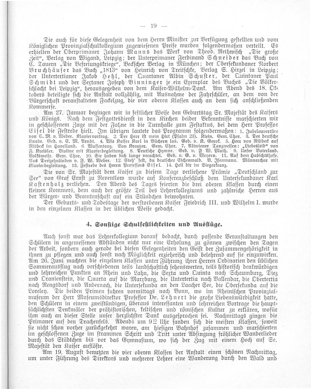 Auch ſonſt war das Lehrerkollegium darauf bedacht, durch paſſende Veranſtaltungen den Schülern in angemeſſenen Abſtänden nicht nur eine Erholung zu gönnen zwiſchen den Tagen der Arbeit, ſondern auch gerade bei dieſen Gelegenheiten den Geiſt der Zuſammengehörigkeit in ihnen zu pflegen und auch ſonſt nach Möglichkeit erzieheriſch und belehrend auf ſie einzuwirken. Am 26. Juni machten die einzelnen Klaſſen unter Führung ihrer Herren Ordinarien den üblichen Sommerausflug nach verſchiedenen teils landſchaftlich ſehenswerten, teils hiſtoriſch denkwürdigen und lehrreichen Punkten an Rhein und Lahn, die Sexta und Quinta nach Schaumburg, Diez und Oranienſtein, die Quarta auf die Marxburg, die Untertertia nach Vallendar, die Obertertia nach Rengsdorf und Andernach, die Unterſekunda an den Laacher See, die Oberſekunda auf die Loreley. Die beiden Primen fuhren vormittags nach Bonn, wo im Rheiniſchen Provinzial⸗ muſeum der Herr Muſeumsdirektor Profeſſor Dr. Lehnert die große Liebenswürdigkeit hatte, den Schülern in einem zweiſtündigen, überaus intereſſanten und lehrreichen Vortrage die haupt⸗ ſächlichſten Denkmäler der prähiſtoriſchen, keltiſchen und römiſchen Kultur zu erklären, wofür ihm auch an dieſer Stelle unſer herzlichſter Dank ausgeſprochen ſei. Nachmittags gingen die Primaner auf den Drachenfels. Abends um 912 Uhr fanden ſich die meiſten Klaſſen, ſoweit ſie nicht ſchon vorher zurückgekehrt waren, am hieſigen Bahnhof zuſammen und marſchierten im geſchloſſenen Zuge im ſtrammen Schritt und Tritt unter Abſingung fröhlicher Wanderlieder durch das Städtchen bis vor das Gymnaſium, wo ſich der Zug mit einem Hoch auf Se. Majeſtät den Kaiſer auflöſte.