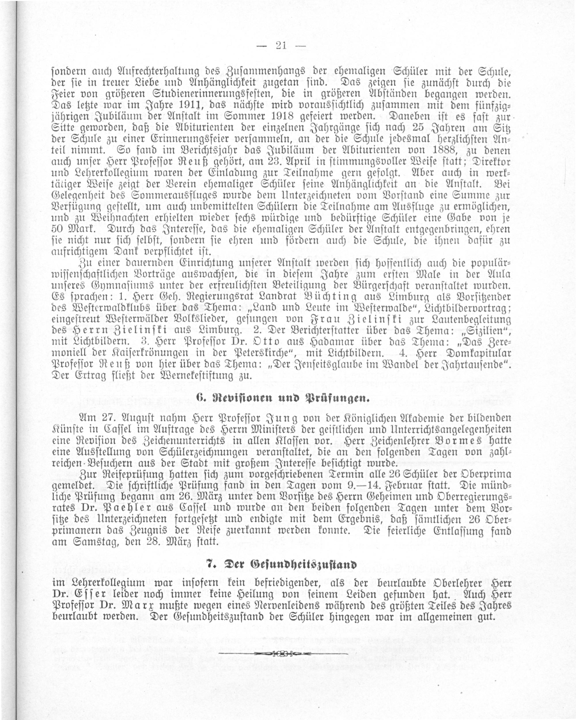 im Lehrerkollegium war inſofern kein befriedigender, als der beurlaubte Oberlehrer Herr Dr. Eſſer leider noch immer keine Heilung von ſeinem Leiden gefunden hat. Auch Herr Profeſſor Dr. Marx mußte wegen eines Nervenleidens während des größten Teiles des Jahres beurlaubt werden. Der Geſundheitszuſtand der Schüler hingegen war im allgemeinen gut.