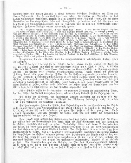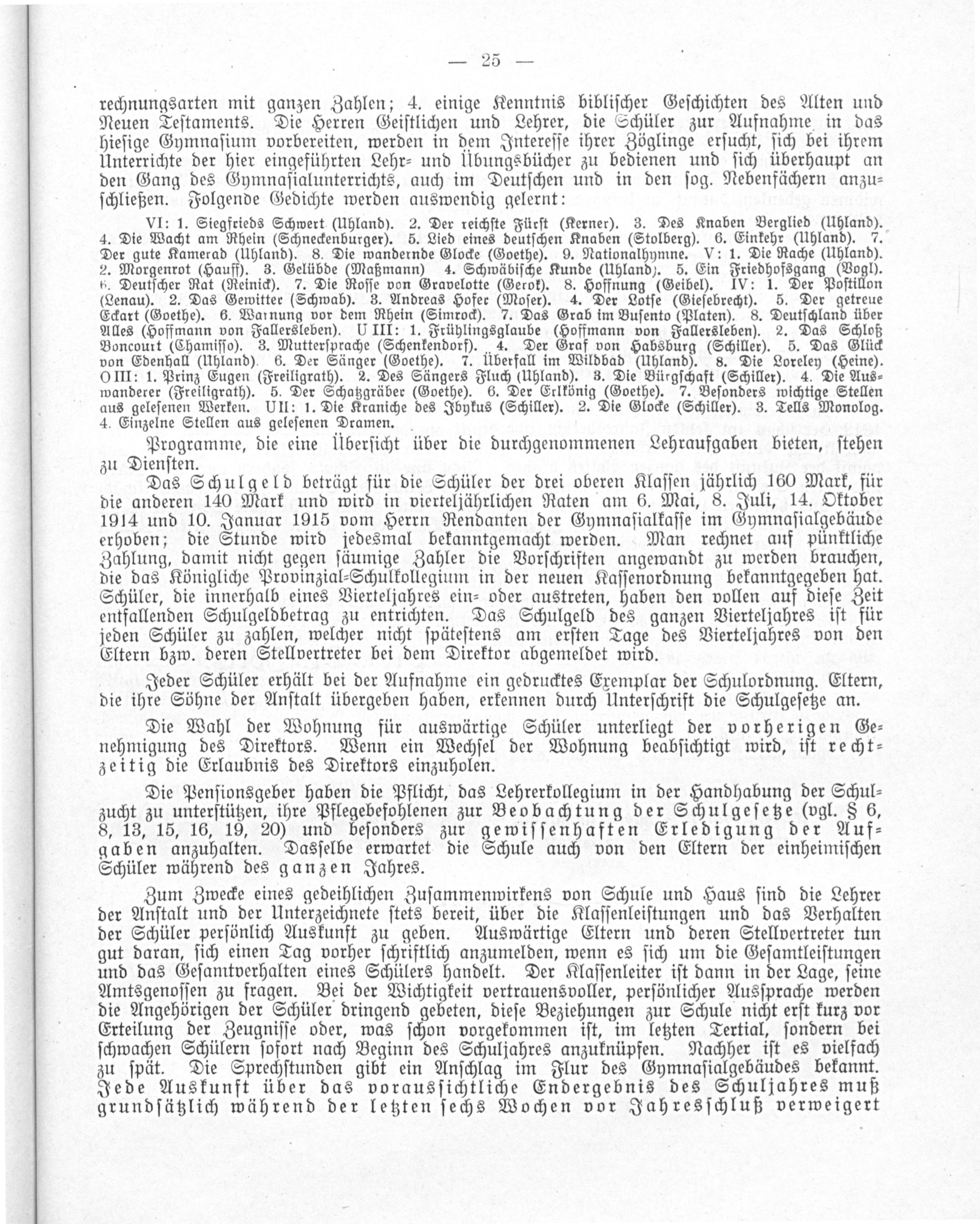 Das Schulgeld beträgt für die Schüler der drei oberen Klaſſen jährlich 160 Mark, für die anderen 140 Mark und wird in vierteljährlichen Raten am 6. Mai, 8. Juli, 14. Oktober 1914 und 10. Januar 1915 vom Herrn Rendanten der Gymnaſialkaſſe im Gymnaſialgebäude erhoben; die Stunde wird jedesmal bekanntgemacht werden. Man rechnet auf pünktliche Zahlung, damit nicht gegen ſäumige Zahler die Vorſchriften angewandt zu werden brauchen, die das Königliche Provinzial⸗Schulkollegium in der neuen Kaſſenordnung bekanntgegeben hat. Schüler, die innerhalb eines Vierteljahres ein⸗ oder austreten, haben den vollen auf dieſe Zeit entfallenden Schulgeldbetrag zu entrichten. Das Schulgeld des ganzen Vierteljahres iſt für jeden Schüler zu zahlen, welcher nicht ſpäteſtens am erſten Tage des Vierteljahres von den Eltern bzw. deren Stellvertreter bei dem Direktor abgemeldet wird.