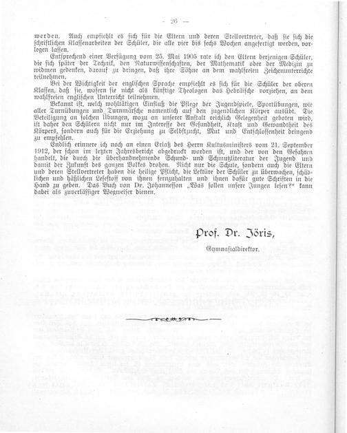 aller Turnübungen und Turnmärſche namentlich auf den jugendlichen Körper ausübt. Die Beteiligung an ſolchen UÜbungen, wozu an unſerer Anſtalt reichlich Gelegenheit geboten wird, iſt daher den Schülern nicht nur im Intereſſe der Geſundheit, Kraft und Gewandtheit des Körpers, ſondern auch für die Erziehung zu Selbſtzucht, Mut und Entſchloſſenheit dringend zu9 empfehlen. 3 Endlich erinnere ich noch an einen Erlaß des Herrn Kultusminiſters vom 21. September 1912, der ſchon im letzten Jahresbericht abgedruckt worden iſt, und der von den Gefahren handelt, die durch die überhandnehmende Schund⸗ und Schmutzliteratur der Jugend und damit der Zukunft des ganzen Volkes drohen. Nicht nur die Schule, ſondern auch die Eltern und deren Stellvertreter haben die heilige Pflicht, die Lektüre der Schüler zu überwachen, ſchäd⸗ lichen und häßlichen Leſeſtoff von ihnen fernzuhalten und ihnen dafür gute Schriften in die Hand zu geben. Das Buch von Dr. Johanneſſon„Was ſollen unſere Jungen leſen?“ kann dabei als zuverläſſiger Wegweiſer dienen.