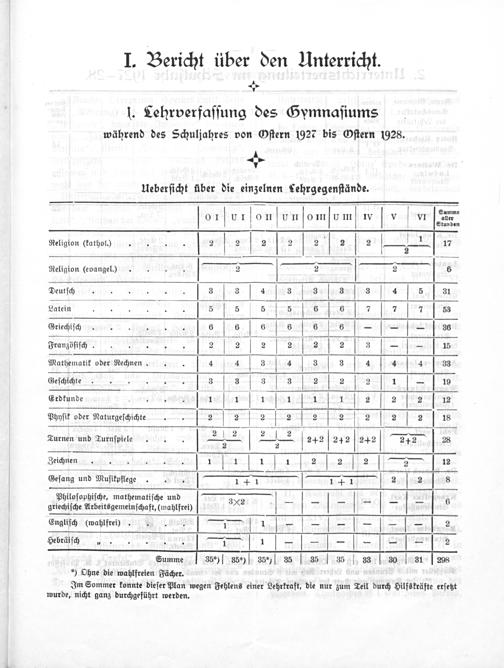 OIUITORſuUnſomſum WV VI r⸗ Religion(kathol.). 2-*E2I2 12 2 2 2 re 17 Religion(evangel.) 2 2 2 6 Deutſch 3 3 4 3 3 3 3 4 5 31 Latein ler uu. 5 5 5 5 6 6 7 7 7¹21 15 Griechiſch 6 6 6 6 6 6——— 3 Franzöſiſch.... 2 2 2 2 11 be,2 3—[o 15 Mathematik oder Rechnen.. 4 V 4 3 4 3 3 4 4 4 33 Geſchicht.... 3 V 3 V 313Z 2 2 1 ‧ 1 Erdkunde Ju.ns 84p 1 3 1 187,1e1ſ2 ſſ 2 e ſ12 Phyſik oder Naturgeſchichte 2 2 2 2 2 2 2 2 V 2 18 Turnen und Turnſpiele—=— 2+ 2 24 2 24+ 2 2*2 28 Zeichnen. rwhelune. 1 1ſ 1 2 2]2—J 12 Geſang und Muſikpflege. 1+ 1 1+ 1 2 2 8 Philoſophiſche, mathematiſche und 3912—.— 2 6 griechiſche Arbeitsgemeinſchaft,(wahlfrei) Engliſch(wahlfrei) 1444————-— 2 Hebraäfſch„. ear——=——-—-—= 2 Summe 35)] 35*)] 35*)] 35 35] 35 33] ⁰ 30 31 298