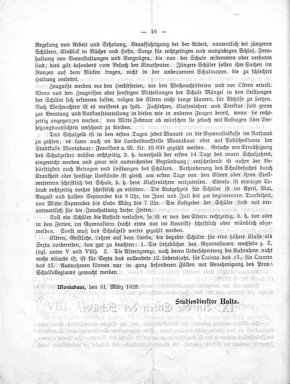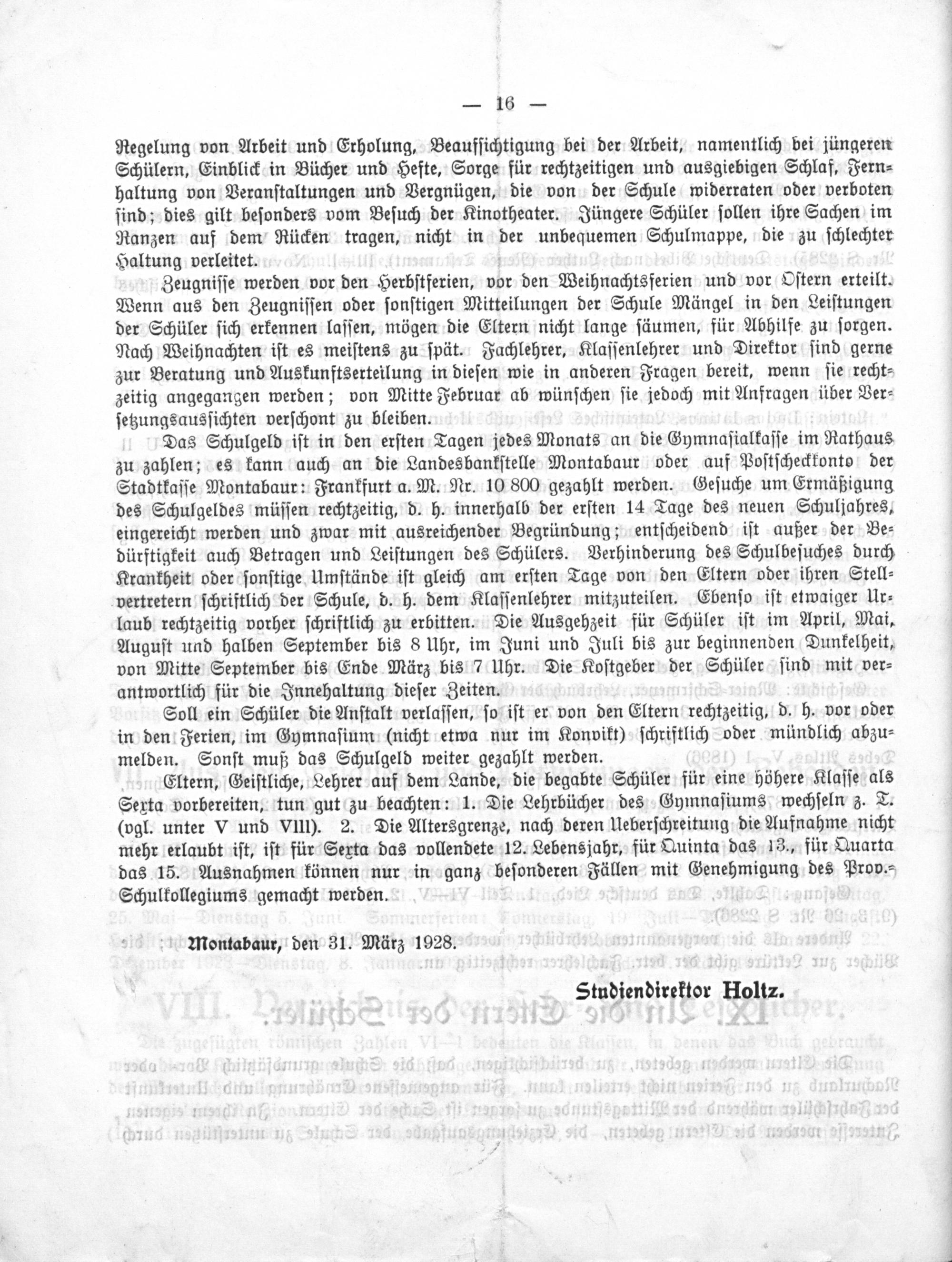 Zeugniſſe werden vor den Herbſtferien, vor den Weihnachtsferien und vor Oſtern erteilt. Wenn aus den Zeugniſſen oder ſonſtigen Mitteilungen der Schule Mängel in den Leiſtungen der Schüler ſich erkennen laſſen, mögen die Eltern nicht lange ſäumen, für Abhilfe zu ſorgen. Nach Weihnachten iſt es meiſtens zu ſpät. Fachlehrer, Klaſſenlehrer und Direktor ſind gerne zur Beratung und Auskunftserteilung in dieſen wie in anderen Fragen bereit, wenn ſie recht⸗ zeitig angegangen werden; von Mitte Februar ab wünſchen ſie jedoch mit Anfragen über Ver⸗ ſetzungsausſichten verſchont zu bleiben.