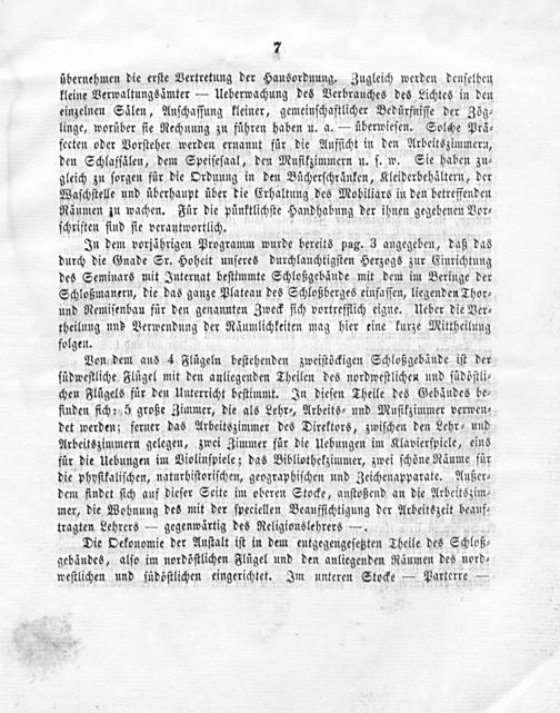 Von dem aus 4 Flügeln beſtehenden zweiſtöckigen Schloßgebäude iſt der ſüdweſtliche Flügel mit den anliegenden Theilen des nordweſtlichen und ſüdöſtli⸗ chen Flügels für den Unterricht beſtimmt. In dieſen Theile des Gebäudes be⸗ finden ſich: 5 große Zimmer, die als Lehr⸗, Arbeits⸗ und Muſikzimmer verwen⸗ det werden; ferner das Arbeitszimmer des Direktors, zwiſchen den Lehr⸗ und Arbeitszimmern gelegen, zwei Zimmer für die Uebungen im Klavierſpiele, eins für die Uebungen im Violinſpiele; das Bibliothekzimmer, zwei ſchöne Räume für die phyſikaliſchen, naturhiſtoriſchen, geographiſchen und Zeichenapparate. Außer⸗ dem findet ſich auf dieſer Seite im oberen Stocke, anſtoßend an die Arbeitszim⸗ mer, die Wohnung des mit der ſpeciellen Beaufſichtigung der Arbeitszeit beauf⸗ tragten Lehrers— gegenwärtig des Religionslehrers—.