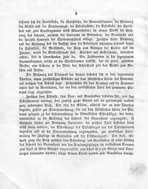 Zwiſchen dem Schloſſe, dem Thor⸗ und Remiſenbau befinden ſich von den Schloßmauern umringt, drei ziemlich große Gärten und ein geräumiger, vordem ganz unbenutzter Platz. Der eine der Gärten, nämlich der an dem Thorbau liegende, gehört zur Directorwohnung; der auf dem ſüdöſtlichen Theile des Pla⸗ teaus gelegene zu der Lehrerwohnung im ſüdweſtlichen Schloßflügel; der dritte, unmittelbar an die Wohnung des Lehrers des Gartenbaus augrenzende, iſt theilweiſe dieſem zur Benutzung überwieſen; der größere Theil deſſelben dient nebſt einem anderen, am Südabhange des Schloßberges vor den Schloßmauern liegenden und an die Directorwohnung angrenzenden, zur praktiſchen Unter⸗ weiſung der Zöglinge im Gartenbau und der Obſtbaumzucht. Der freie, ehe⸗ mals ganz öde Platz zwiſchen dem Schloßwege und Remiſenbau iſt unter Leitung des Lehrers des Gartenbaus von den Seminarzöglingen im verfloſſenen Sommer zum Theil in ſchöne Anlagen umgewandelt, zum Theil iſt er zur Anlage eines Turn⸗ platzes verwendet worden; einige kleinere Theile werden zum Gemüſebau benutzt.