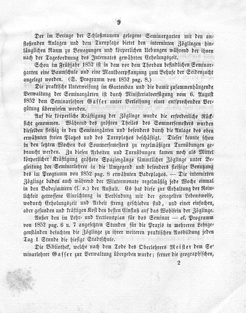Die praktiſche Unterweiſung im Gartenbau und die damit zuſammenhängende Verwaltung der Seminargärten iſt durch Miniſterialverfügung vom 6. Auguſt 1852 dem Seminarlehrer Gaſſer unter Verleihung einer entſprechenden Ver⸗ gütung überwieſen worden.