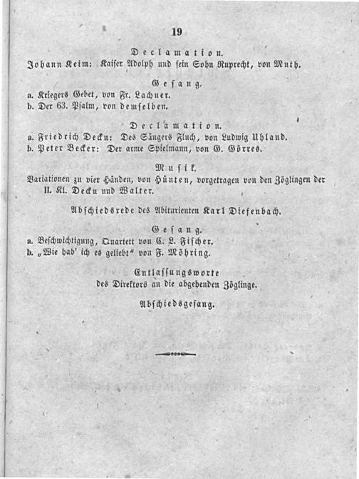 Declamation. a. Friedrich Decku: Des Sängers Fluch, von Ludwig Uhland. b. Peter Becker: Der arme Spielmann, von G. Görres.