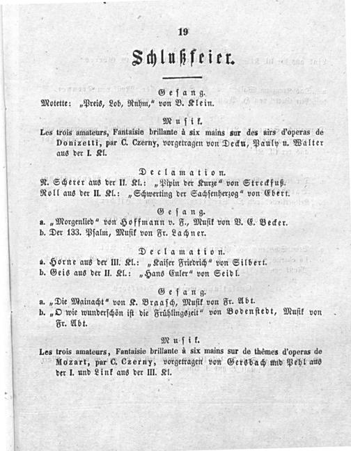 Declamation. N. Scherer aus der II. Kl.:„Pipin der Kurze“ von Streckfuß. Roll aus der II. Kl.:„Schwerting der Sachſenherzog“ von Ebert.