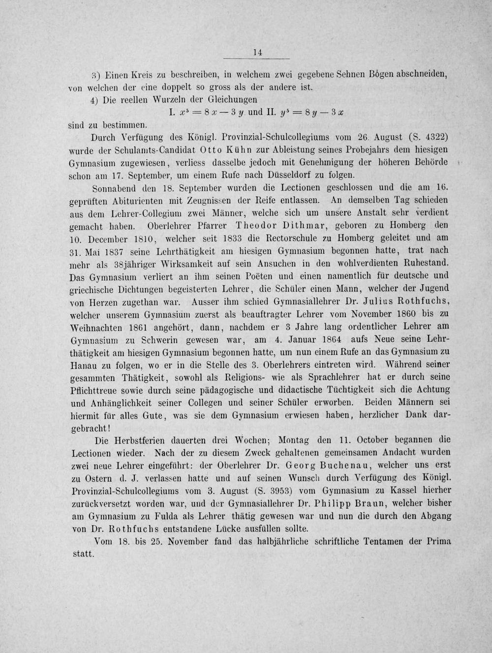 Die Herbstferien dauerten drei Wochen; Montag den 11. October begannen die Lectionen wieder. Nach der zu diesem Zweck gehaltenen gemeinsamen Andacht wurden zwei neue Lehrer eingeführt: der Oberlehrer Dr. Georg Buchenau, welcher uns erst zu Ostern d. J. verlassen hatte und auf seinen Wunsch durch Verfügung des Königl. Provinzial-Schulcollegiums vom 3. August(S. 3953) vom Gymnasium zu Kassel hierher zurückversetzt worden war, und der Gymnasiallehrer Dr. Philipp Braun, welcher bisher am Gymnasium zu Fulda als Lehrer thätig gewesen war und nun die durch den Abgang von Dr. Rothfuchs entstandene Lücke ausfüllen sollte.