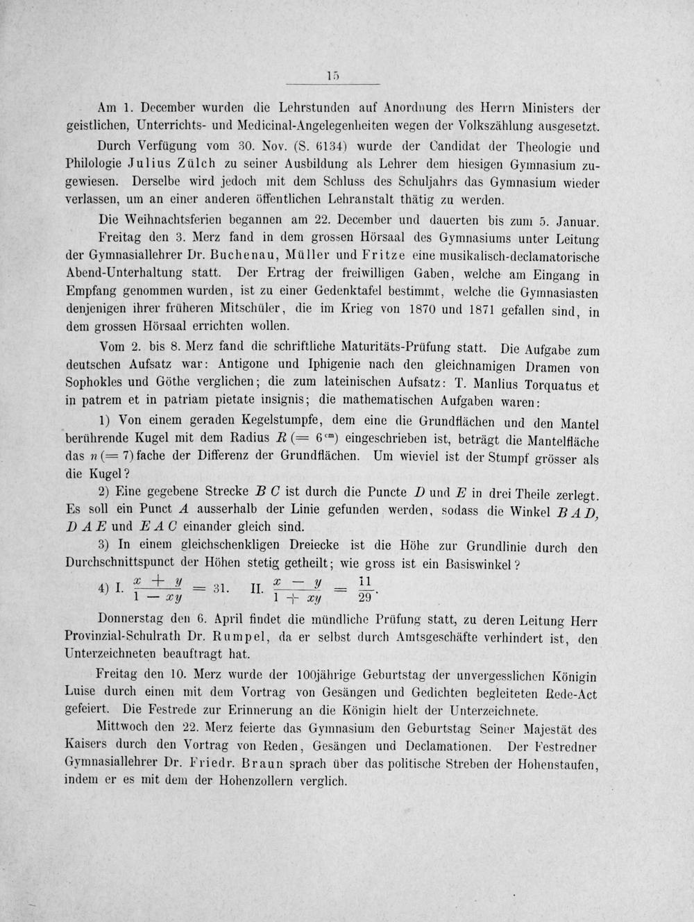 15 Am 1. December wurden die Lehrstunden auf Anordnung des Herrn Ministers der geistlichen, Unterrichts- und Medicinal-Angelegenheiten wegen der Volkszählung ausgesetzt.