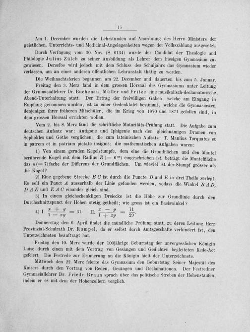 Mittwoch den 22. Merz feierte das Gymnasium den Geburtstag Seiner Majestät des Kaisers durch den Vortrag von Reden, Gesängen und Declamationen. Der Festredner Gymnasiallehrer Dr. Friedr. Braun sprach über das politische Streben der Hohenstaufen, indem er es mit dem der Hohenzollern verglich.