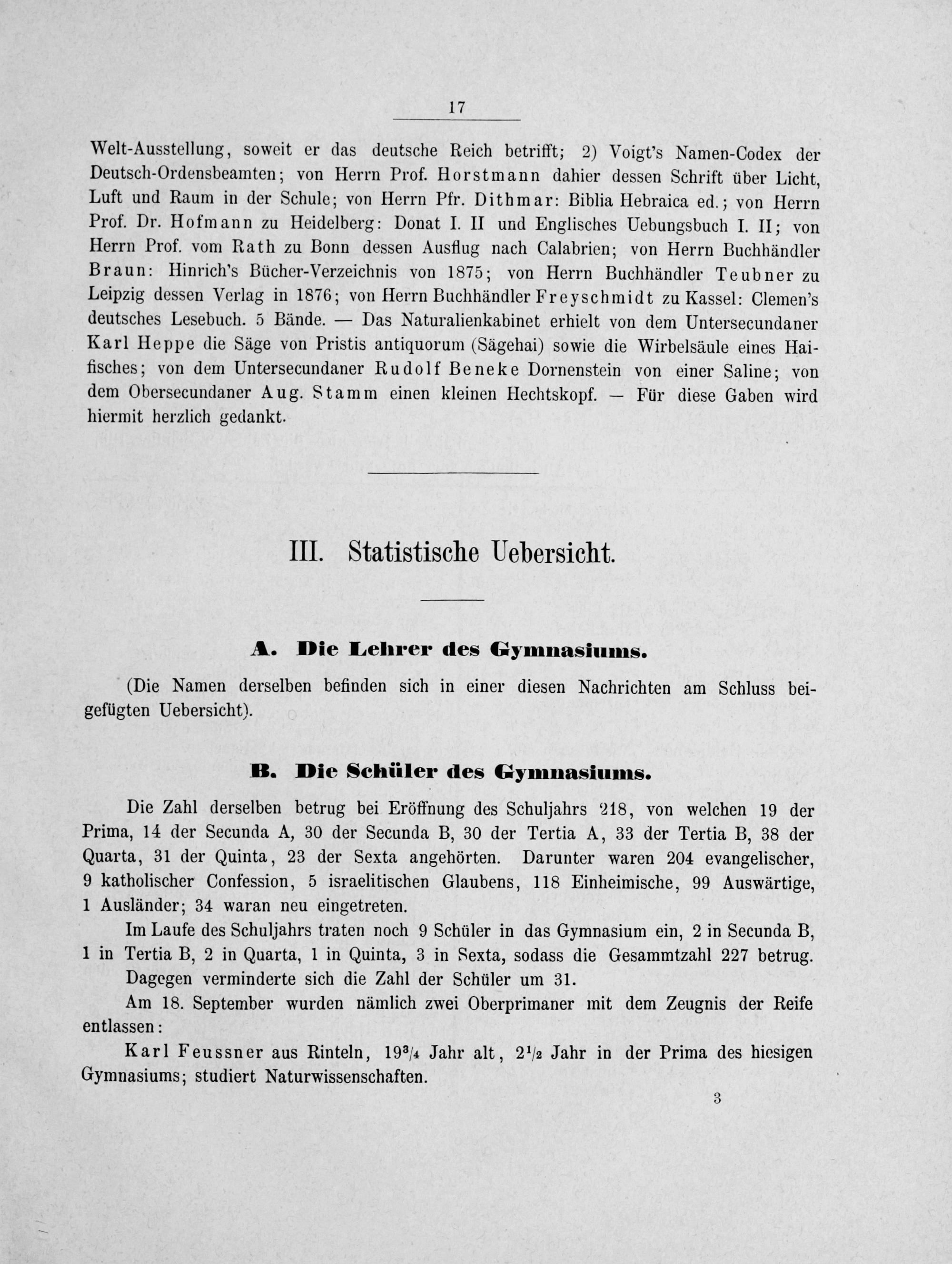 Welt-Ausstellung, soweit er das deutsche Reich betrifft; 2) Voigt's Namen-Codex der Deutsch-Ordensbeamten; von Herrn Prof. Horstmann dahier dessen Schrift über Licht, Luft und Raum in der Schule; von Herrn Pfr. Dithmar: Biblia Hebraica ed.; von Herrn Prof. Dr. Hofmann zu Heidelberg: Donat I. II und Englisches Uebungsbuch I. II; von Herrn Prof. vom Rath zu Bonn dessen Ausflug nach Calabrien; von Herrn Buchhändler Braun: Hinrich's Bücher-Verzeichnis von 1875; von Herrn Buchhändler Teubner zu Leipzig dessen Verlag in 1876; von Herrn Buchhändler Freyschmidt zu Kassel: Clemen's deutsches Lesebuch. 5 Bände.— Das Naturalienkabinet erhielt von dem Untersecundaner Karl Heppe die Säge von Pristis antiquorum(Sägehai) sowie die Wirbelsäule eines Hai- fisches; von dem Untersecundaner Rudolf Beneke Dornenstein von einer Saline; von dem Obersecundaner Aug. Stamm einen kleinen Hechtskopf.— Für diese Gaben wird hiermit herzlich gedankt.