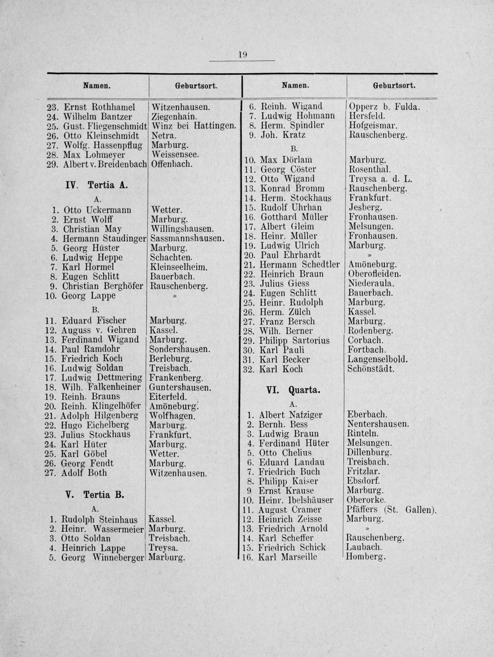 Namen. Geburtsort. Namen. 23. Ernst Rothhamel Witzenhausen. 6. Reinh. Wigand 24. Wilhelm Bantzer Ziegenhain. 7. Ludwig Hohmann 25. Gust. Fliegenschmidt Winz bei Hattingen. S8. Herm. Spindler 26. Otto Kleinschmidt Netra. 9. Joh. Kratz 27. Wolfg. Hassenpflug Marburg. B 28. Max Lohmeyer Weissensee. 29. Albert v. Breidenbach Offenbach. 10. Max Dörlam 11. Georg Cöster ; 12. Otto Wigand IV. Tertia A. 13. Konrad Bromm A. 14. Herm. Stockhaus 1. Otto Uckermann Wetter. 15. Rudolf Uhrhan 2. Ernst Wolff Marburg. 16. Gotthard Müller 3. Christian May Willingshausen. 17. Albert Gleim 4. Hermann Staudinger Sassmannshausen.[18. Heinr. Müller 5. Georg Hüster Marburg. 19. Ludwig Ulrich 6. Ludwig Heppe Schachten. 20. Paul Ehrhardt 7. Karl Hormel Kleinseelheim. 21. Hermann Schedtler 8. Eugen Schlitt Bauerbach. 22. Heinrich Braun 9. Christian Berghöfer Rauschenberg. 23. Julius Giess 10. Georg Lappe„ 24. Eugen Schlitt 25. Heinr. Rudolph B. 26. Herm. Zülch 11. Eduard Fischer Marburg. 27. Franz Bersch 12. Auguss v. Gehren Kassel. 28. Wilh. Berner 13. Ferdinand Wigand Marburg. 29. Philipp Sartorius 14. Paul Ramdohr Sondershausen. 30. Karl Pauli 15. Friedrich Koch Berleburg. 31. Karl Becker 16. Ludwig Soldan Treisbach. 32. Karl Koch 17 lardis Hettmerine Frankenberg. 18. Wilh. Falkenheiner Guntershausen. 19. Reinh. Brauns Eiterfeld. VI. CQuarta⸗ 20. Reinh. Klingelhöfer Amöneburg. A. 21. Adolph Hilgenberg Wolfhagen. 1. Albert Natfziger 22. Hugo Eichelberg Marburg. 2. Bernh. Bess 23. Julius Stockhaus Frankfurt. 3. Ludwig Braun 24. Karl Hüter Marburg. 4. Ferdinand Hüter 25. Karl Göbel Wetter. 5. Otto Chelius 26. Georg Fendt Marburg. 6. Eduard Landau 27. Adolf Both Witzenhausen. 7. Friedrich Buch 8. Philipp Kaiser 9 Ernst Krause V. Tertia B. 10. Heinr. Ibelshäuser A. 11. August Cramer 1. Rudolph Steinhaus Kassel. 12. Heinrich Zeisse 2. Heinr. Wassermeier Marburg. 13. Friedrich Arnold 3. Otto Soldan Treisbach. 14. Karl Scheffer 4. Heinrich Lappe Treysa. 15. Friedrich Schick 5. Georg Winneberger Marburg. 16. Karl Marseille