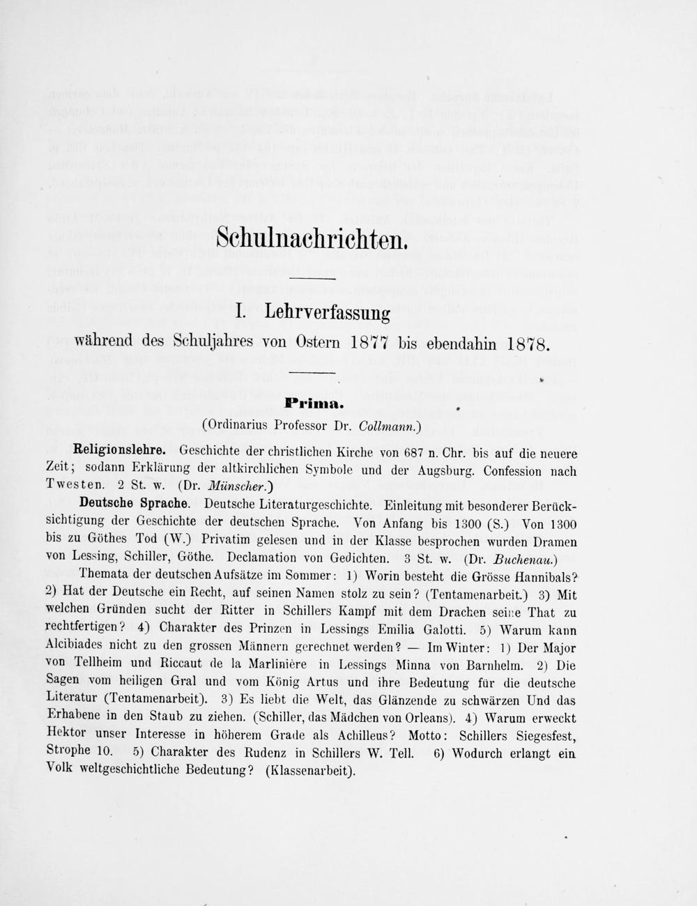 I. Lehrverfassung während des Schuljahres von Ostern 1877 bis ebendahin 1878.