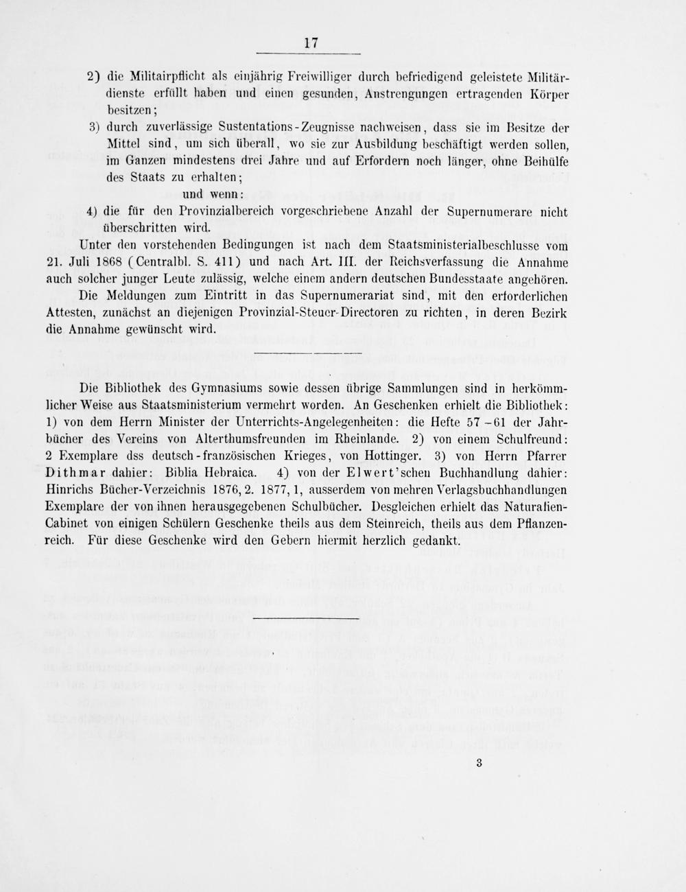 Die Bibliothek des Gymnasiums sowie dessen übrige Sammlungen sind in herkömm- licher Weise aus Staatsministerium vermehrt worden. An Geschenken erhielt die Bibliothek: 1) von dem Herrn Minister der Unterrichts-Angelegenheiten: die Hefte 57— 61 der Jahr- bücher des Vereins von Alterthumsfreunden im Rheinlande. 2) von einem Schulfreund: 2 Exemplare dss deutsch-französischen Krieges, von Hottinger. 3) von Herrn Pfarrer Dithmar dahier: Biblia Hebraica. 4) von der Elwert'schen Buchhandlung dahier: Hinrichs Bücher-Verzeichnis 1876, 2. 1877, 1, ausserdem von mehren Verlagsbuchhandlungen Exemplare der von ihnen herausgegebenen Schulbücher. Desgleichen erhielt das Naturalien- Cabinet von einigen Schülern Geschenke theils aus dem Steinreich, theils aus dem Pflanzen- reich. Für diese Geschenke wird den Gebern hiermit herzlich gedankt.