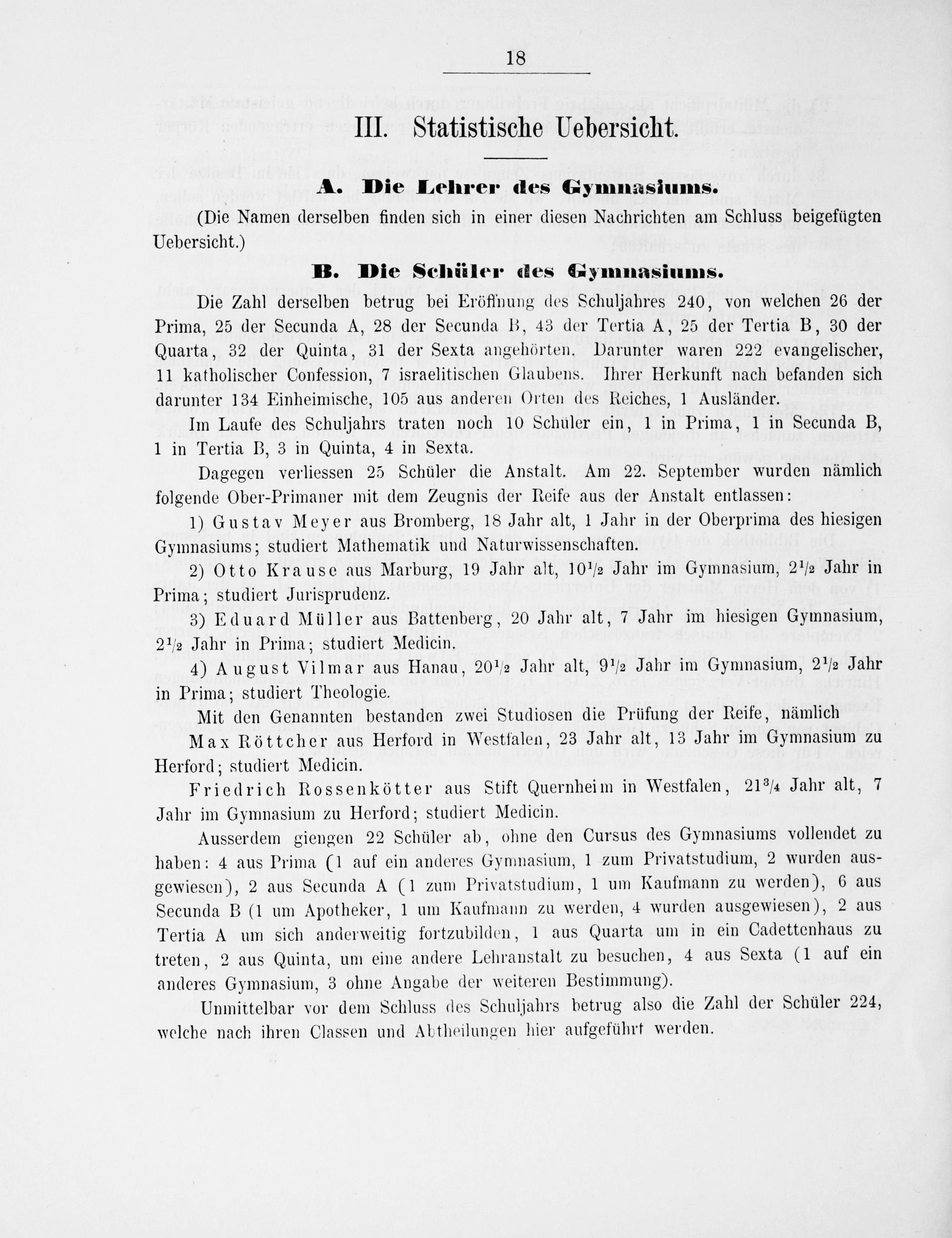 Ausserdem giengen 22 Schüler ab, ohne den Cursus des Gymnasiums vollendet zu haben: 4 aus Prima(1 auf ein anderes Gymnasium, 1 zum Privatstudium, 2 wurden aus- gewiesen), 2 aus Secunda A(1 zum Privatstudium, 1 um Kaufmann zu werden), 6 aus Secunda B(1 um Apotheker, l um Kaufmann zu werden, 4 wurden ausgewiesen), 2 aus Tertia A um sich anderveitig fortzubilden, l aus Quarta um in ein Cadettenhaus zu treten, 2 aus Quinta, um eine andere Lehranstalt zu besuchen, 4 aus Sexta(1 auf ein anderes Gymnasium, 3 ohne Angabe der weiteren Bestimmung).