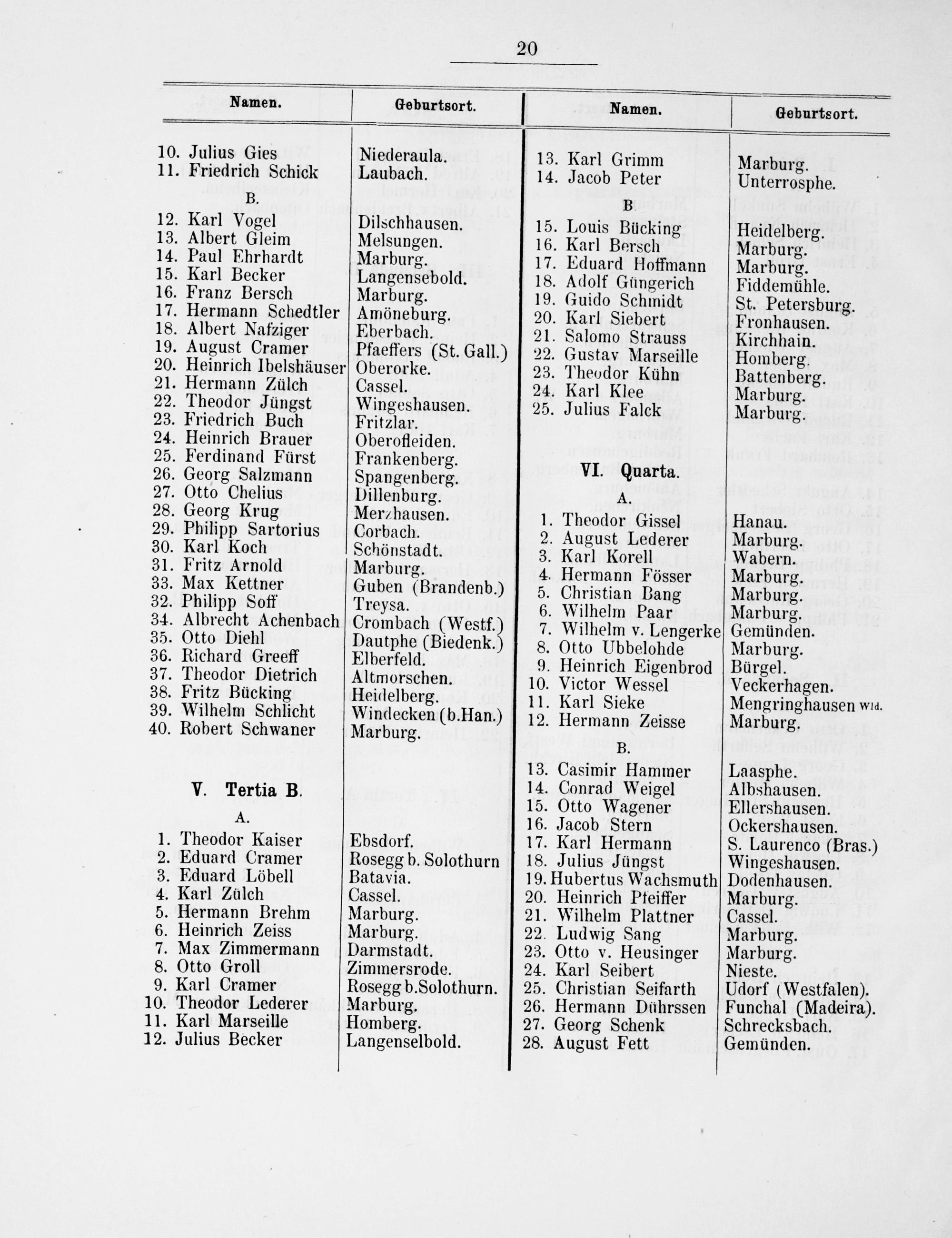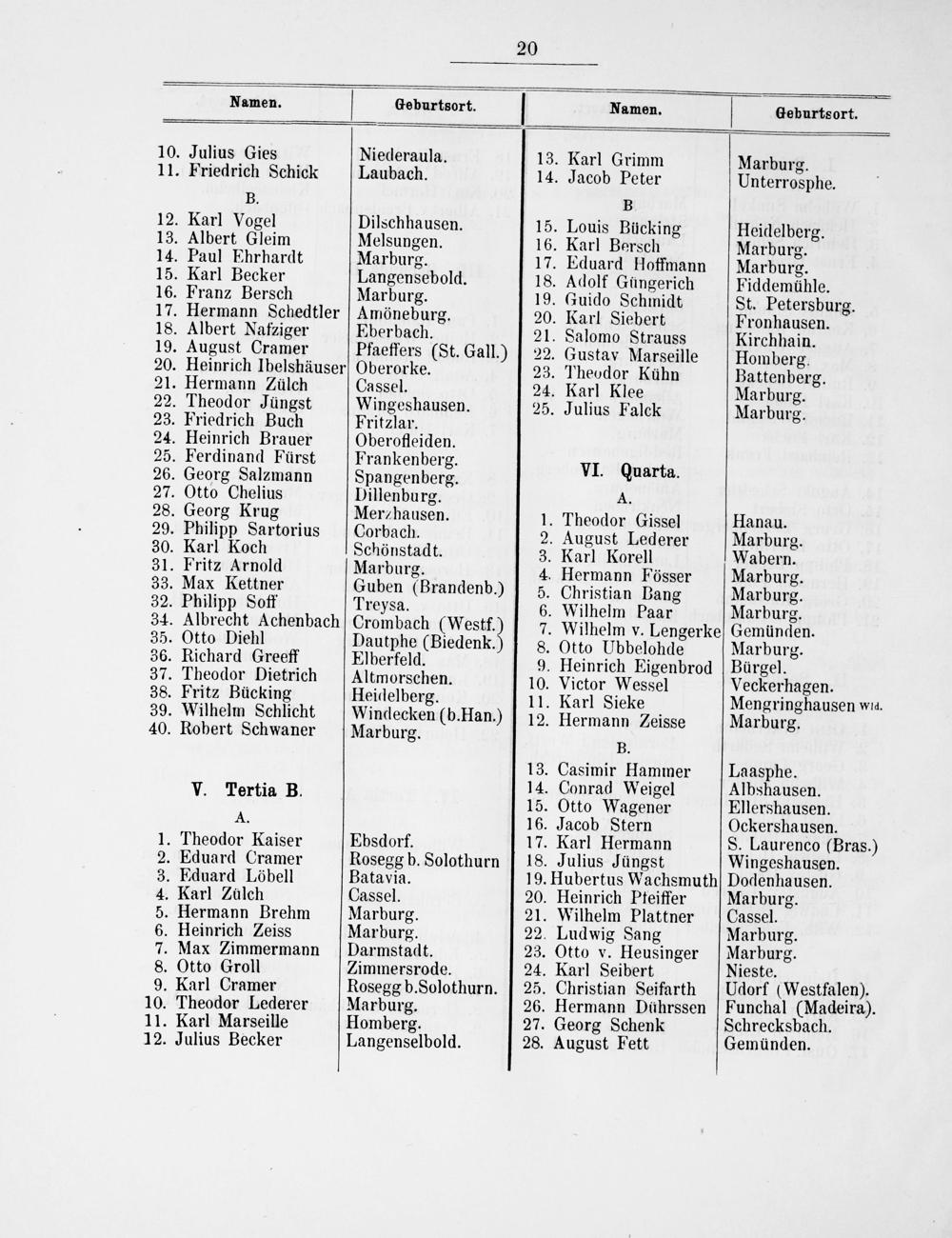 13. Albert Gleim Melsungen. 16. Karl Bersch 5 Wanerdeig. 14. Paul Ehrhardt Marburg. 17. Eduard Hoffmann Marburg. 15. Karl Becker Langensebold. 18. Adolf Güngerich Fiddemühle. 16. Franz Bersch Marburg. 19. Guido Schmidt St. Petersburg. 17. Hermann Schedtler Amöneburg. 20. Karl Siebert Fronhausen. 18. Albert Nafziger Eberbach. 21. Salomo Strauss Kirchhain. 19. August Cramer Pfaeffers(St. Gall.) 22. Gustav Marseille Homberg. 20. Heinrich Ibelshäuser Oberorke. 23. Theodor Kühn Battenberg 5 Nermann auleh Cassel. 24. Karl Klee Marburg. 3