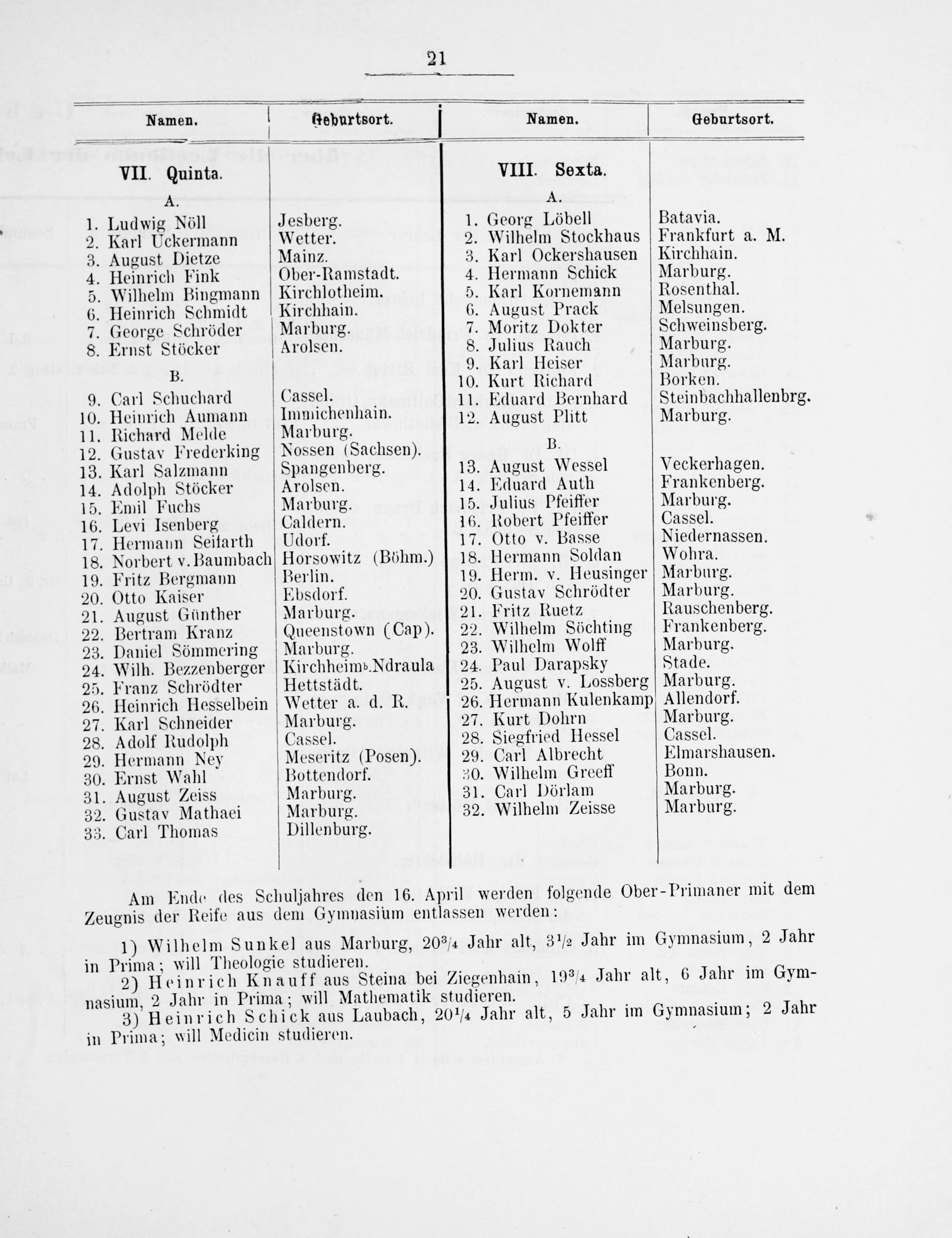 Geburtsort. Namen Geburtsort. VII. Quinta. VIII. Sexta. A. A. Ludwig Nöll Jesberg. 1. Georg Löbell Batavia. . Karl Uckermann Wetter. 2. Wilhelm Stockhaus Frankfurt a. M. .August Dietze Mainz. 3. Karl Ockershausen Kirchhain. . Heinrich Fink Ober-Ramstadt. 4. Hermann Schick Marburg. Wilhelm Bingmann Kirchlotheim. 5. Karl Kornemann Rosenthal. Heinrich Schmidt Kirchhain. 6. August Prack Melsungen. . George Schröder Marburg. 7. Moritz Dokter Schweinsberg. Ernst Stöcker Arolsen. 8. Julius Rauch Marburg. B 9. Karl Heiser Marburg. 4 10. Kurt Richard Borken. Gann Sehenaimm Lasselfe dn 11. Eduard Bernhard Steinbachhallenbrg. 2-10— 9. 5 1 1.„ .Richard Melde. Marburg. 2 Ausust. ntt Mardutg. Gustav Frederking Nossen(Sachsen). B. . Karl Salzmann Spangenberg. 13. August Wessel Veckerhagen. .Adolph Stöcker Arolsen. 14. Eduard Auth Frankenberg. . Emil Fuchs Marburg. 15. Julius Pfeiffer Marburg. . Levi Isenberg Caldern. 16. Robert Pfeiffer Cassel. Hermanmn Seifarth Udorf. 17. Otto v. Basse Niedernassen. Norbert v. Baumbach Horsowitz(Böhm.) 18. Hermann Soldan Wohra. . Fritz Bergmann Berlin. 19. Herm. v. Heusinger Marburg. .Otto Kaiser Ebsdorf. 20. Gustav Schrödter Marburg. .August Günther Marburg. 21. Fritz Ruetz Rauschenberg. Bertram Kranz Queenstown(Cap). 22. Wilhelm Söchting Frankenberg. Daniel Sömmering Marburg. 23. Wilhelm Wolff Marburg. „Wilh. Bezzenberger KirchheimNdraula 24. Paul Darapsky Stade. .Franz Schrödter Hettstädt. 25. August v. Lossberg Marburg. z. Heinrich Hesselbein Wetter a. d. R. 26. Hermann Kulenkamp Allendorf. . Karl Schneider Marburg. 27. Kurt Dohrn Marburg. .Adolf Rudolph Cassel. 28. Siegfried Hessel Cassel. . Hermann Ney Meseritz(Posen). 29. Carl Albrecht Elmarshausen. . Ernst Wahl Bottendorf. 30. Wilhelm Greeff Bonn. .August Zeiss Marburg. 31. Carl Dörlam Marburg. 2. Gustav Mathaei Marburg. 32. Wilhelm Zeisse Marburg. 3. Carl Thomas Dillenburg.